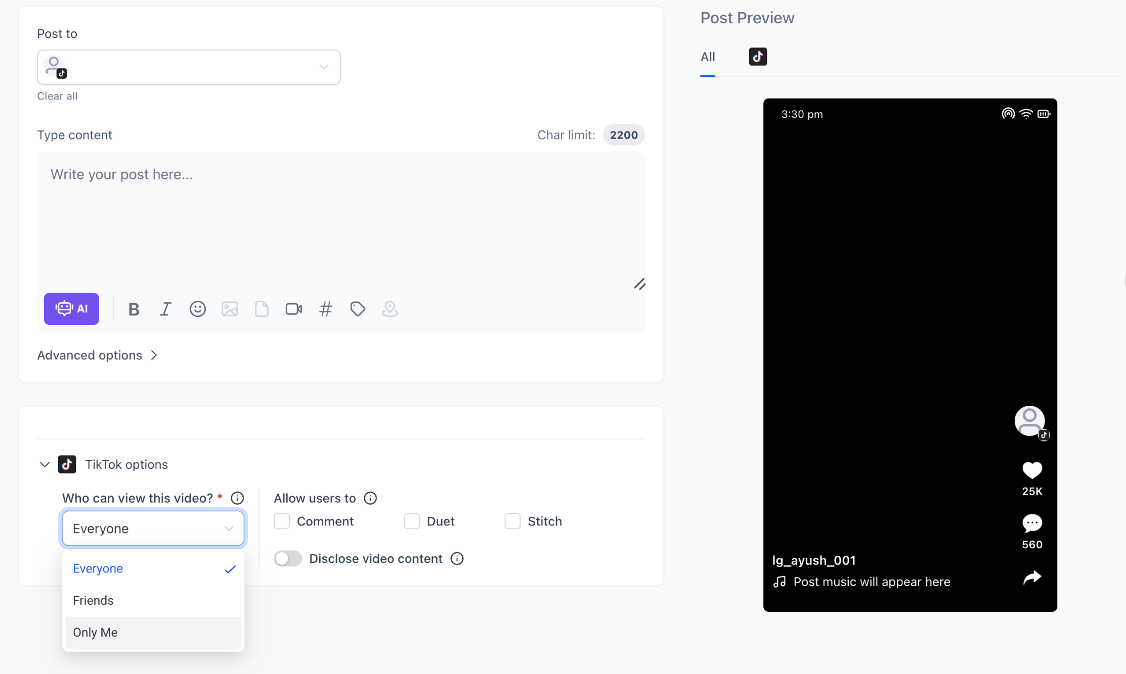For TikTok business accounts, user can now select any privacy level (previously restricted to public only).