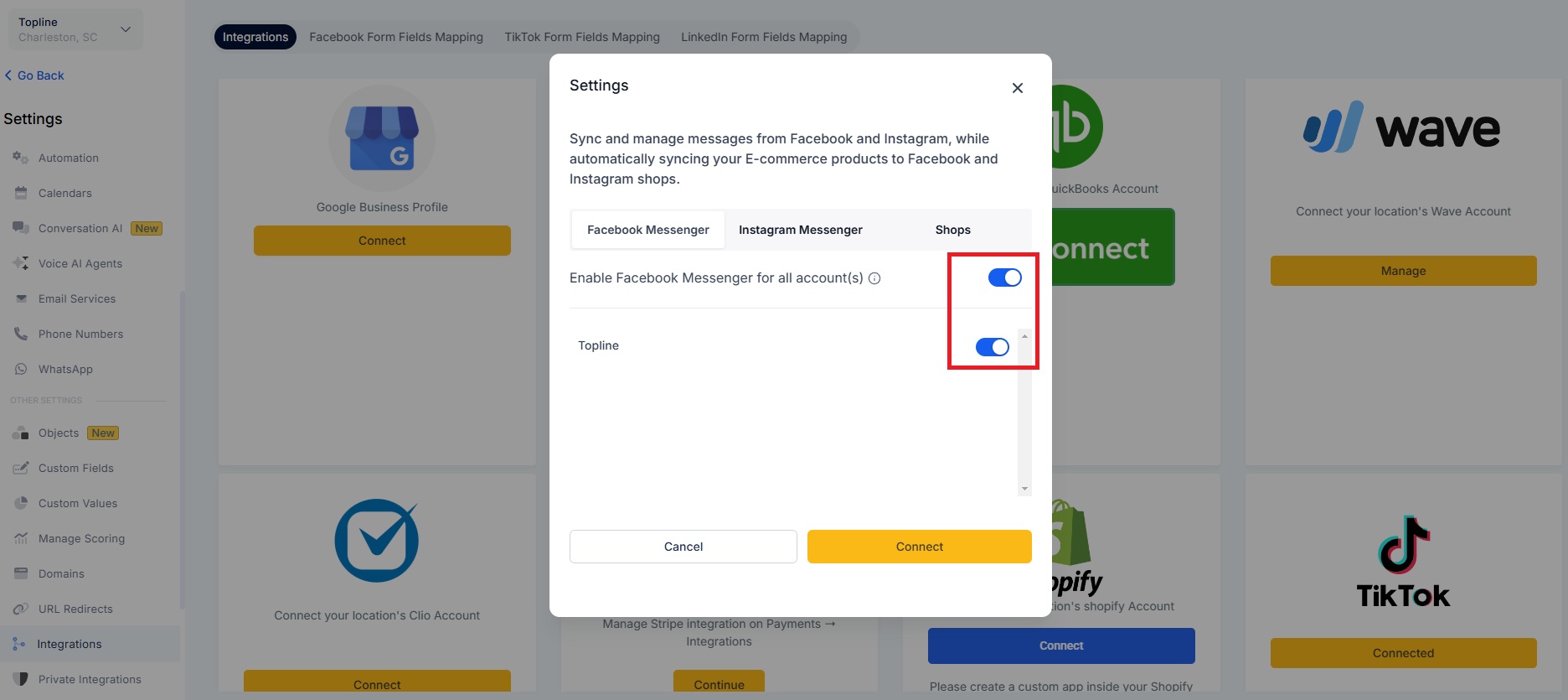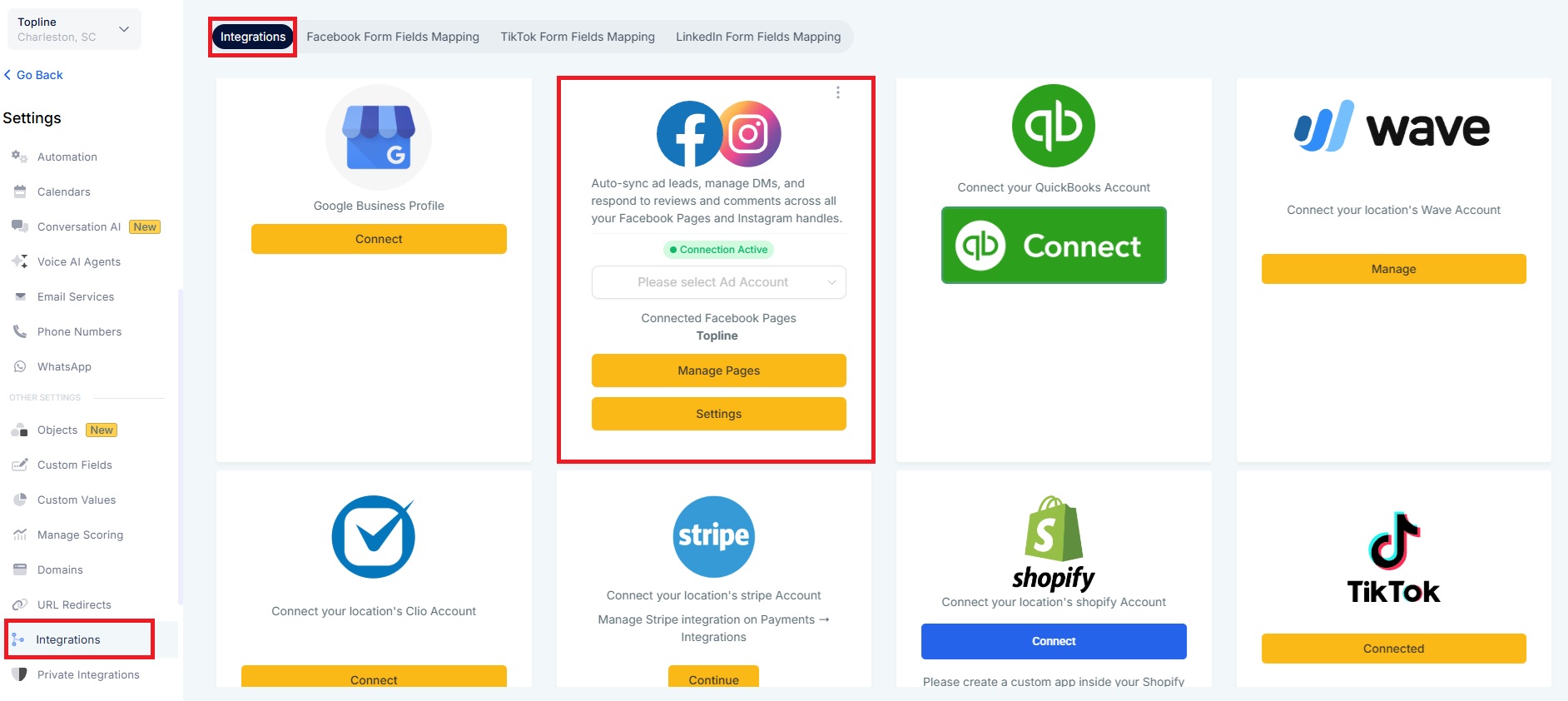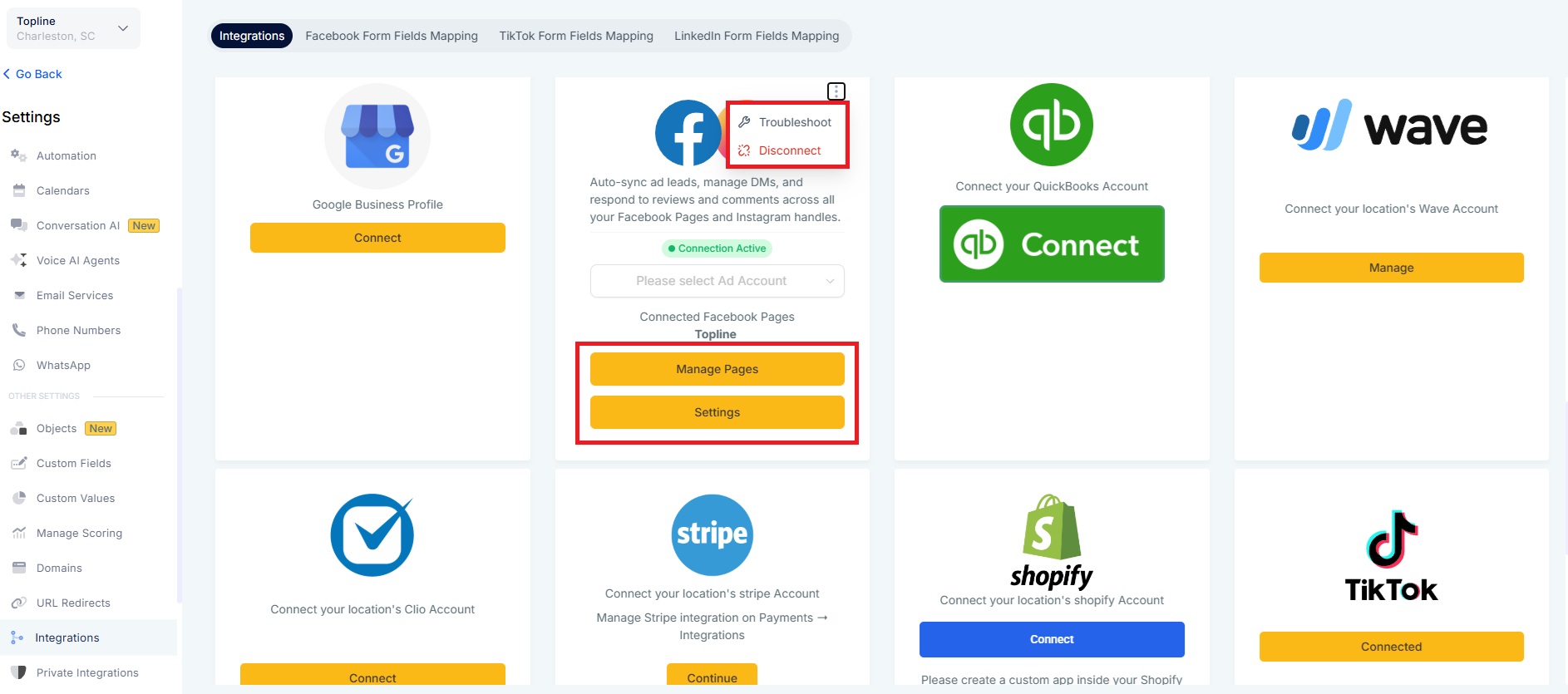 Updated FB card with Manage pages and Settings option to select update connected pages & enable messaging.