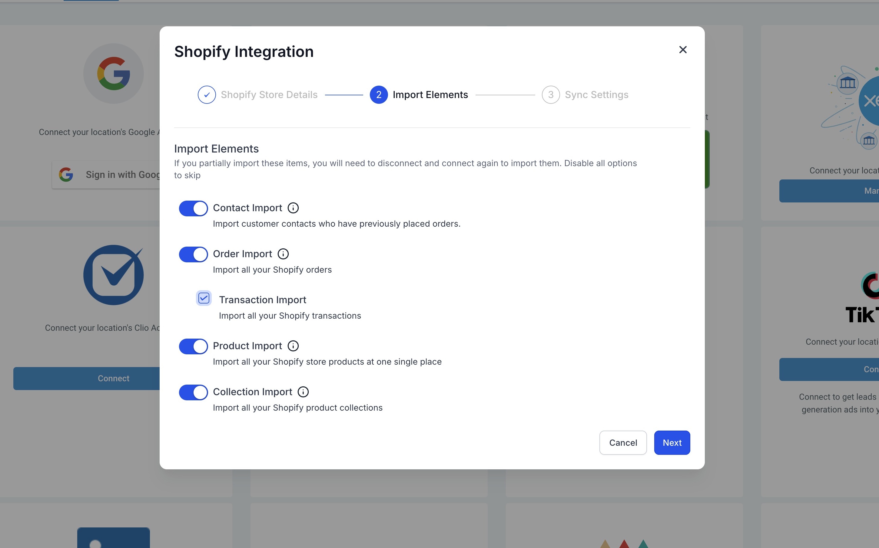 Select Data to Import: In the second step, users will be directed to the Import Elements screen, where they can select which data to import from their Shopify store. The available options for import are: Contacts, Orders, Transactions, Products, Collections.
