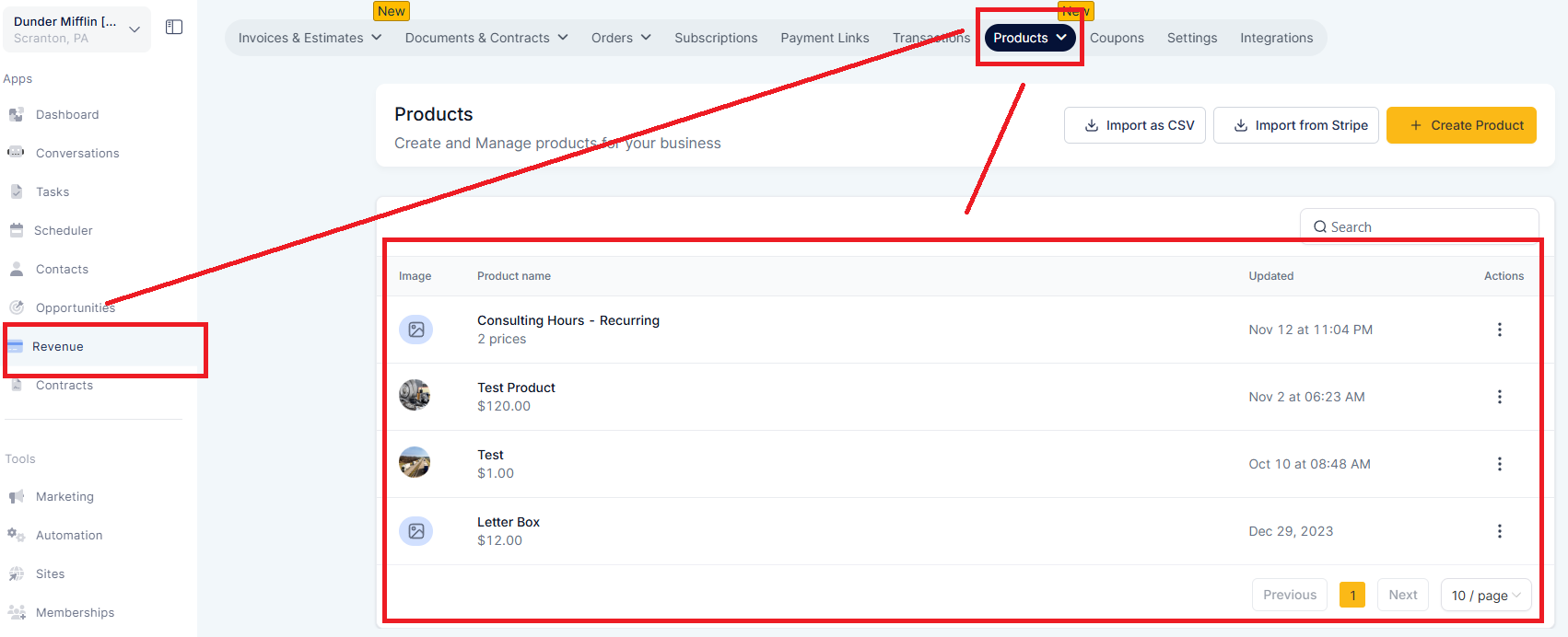Imported products can be seen in Revenue > Products