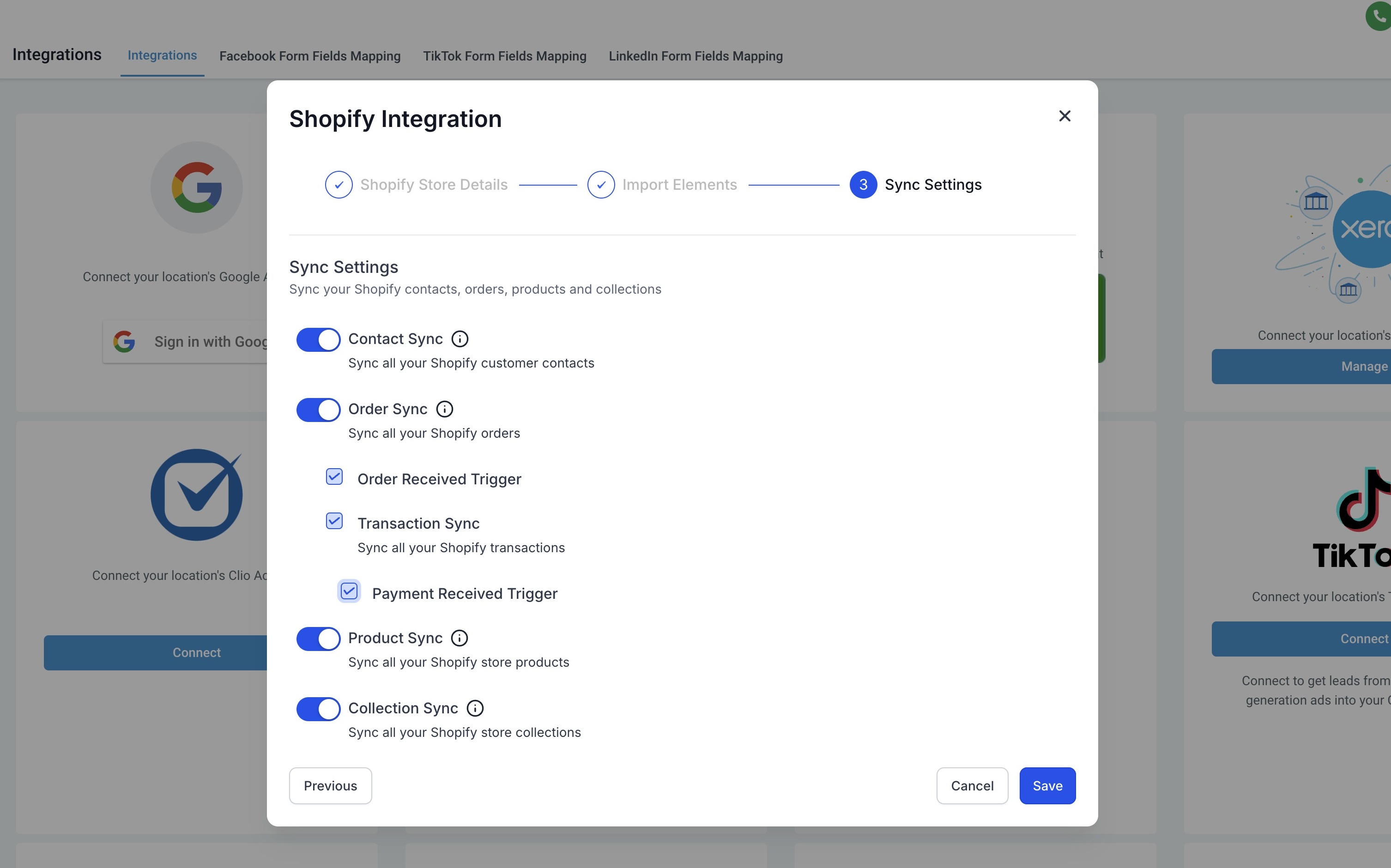 Manage Settings: Once the Shopify integration is successfully connected, users can enable or disable the elements they want to sync for future orders from the Shopify store.
