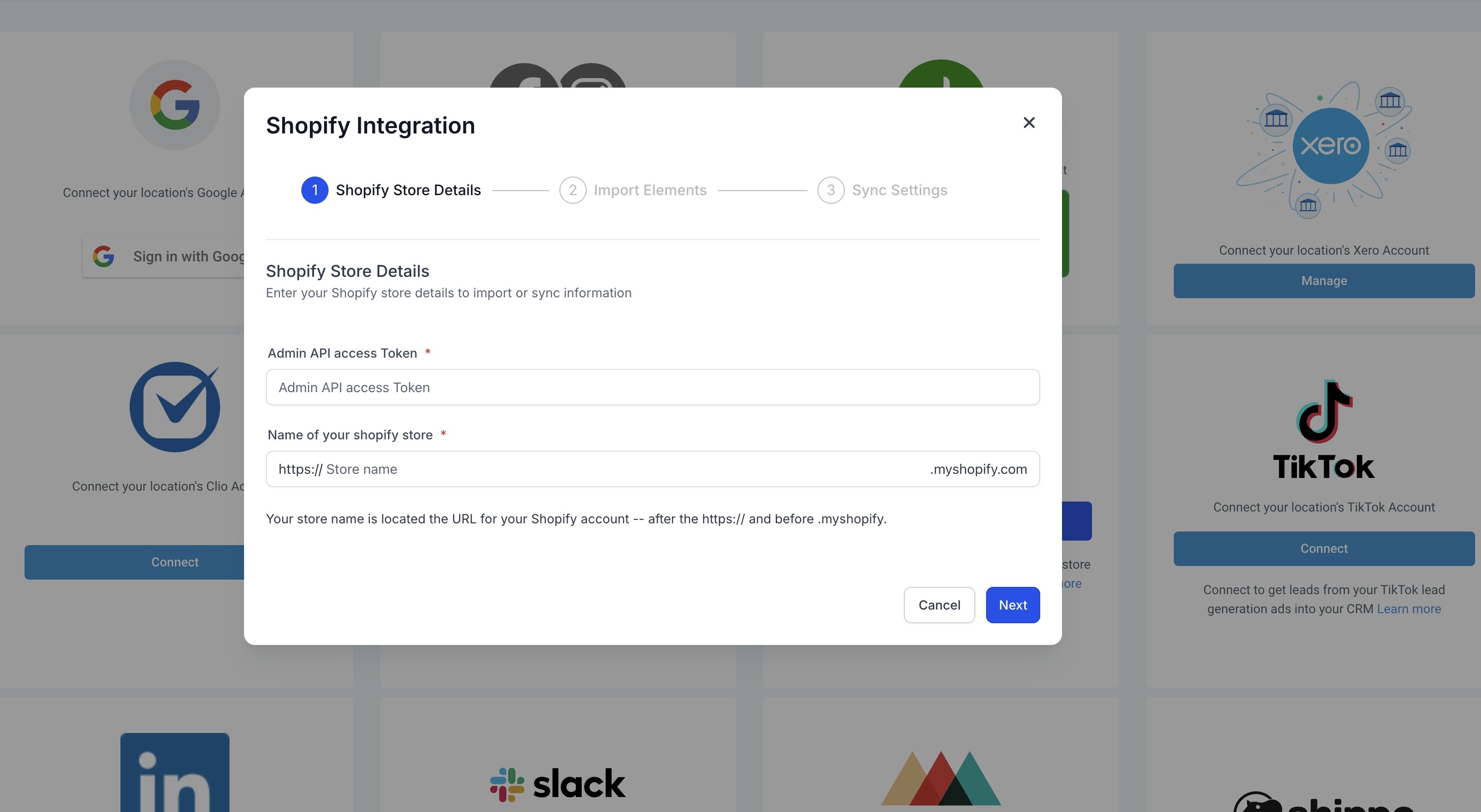 Connect the Shopify Store: Users can click on connect button to begin the setup. A modal will appear where users must enter Admin API access Token and a valid Shopify store URL as the first step.