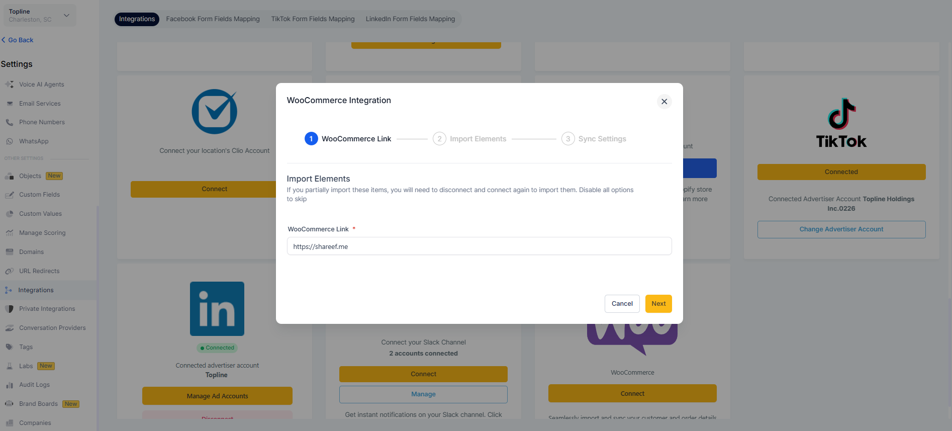Connect the WooCommerce Store: Users can click on "connect" button to begin the setup. A modal will appear where users must enter a valid WooCommerce store URL