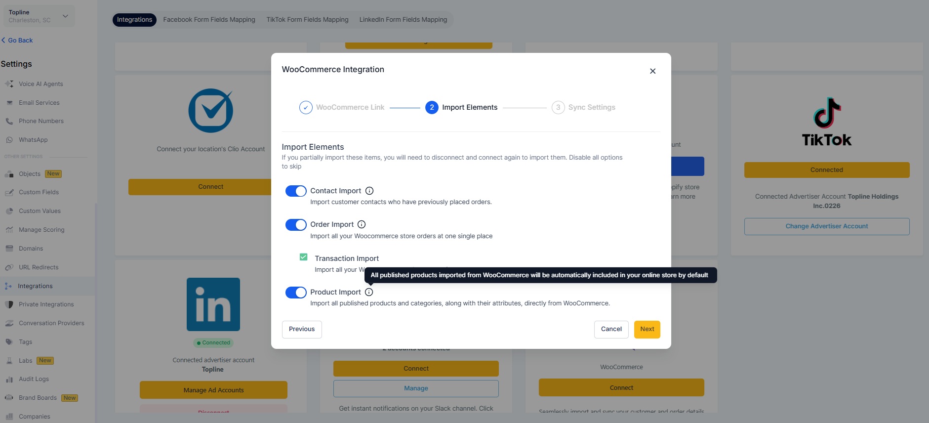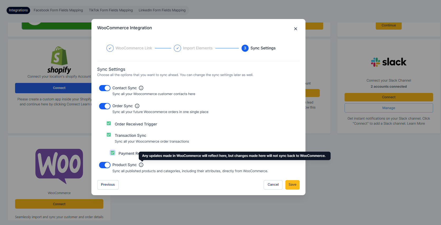 Once the WooCommerce integration is successfully connected, users can enable or disable the elements they want to sync for future orders from the WooCommerce store.