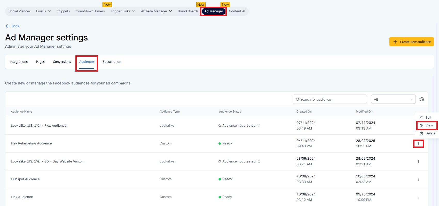 Select “Lookalike” or “Retargeting” to view the respective list of lookalike and custom audiences.