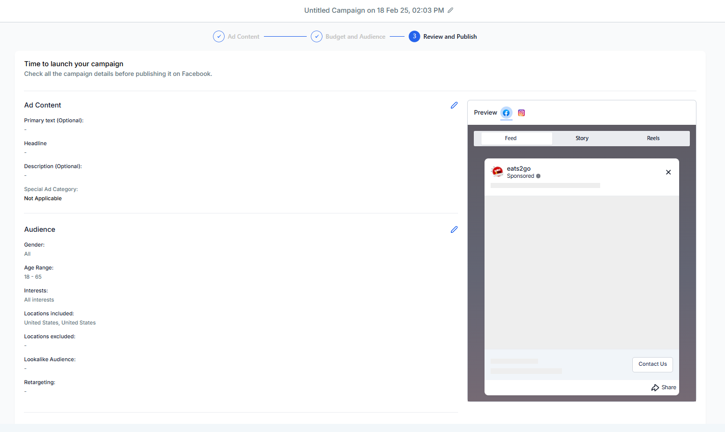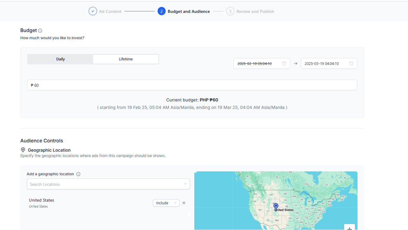 Set your budget, targeting, and ad creatives.