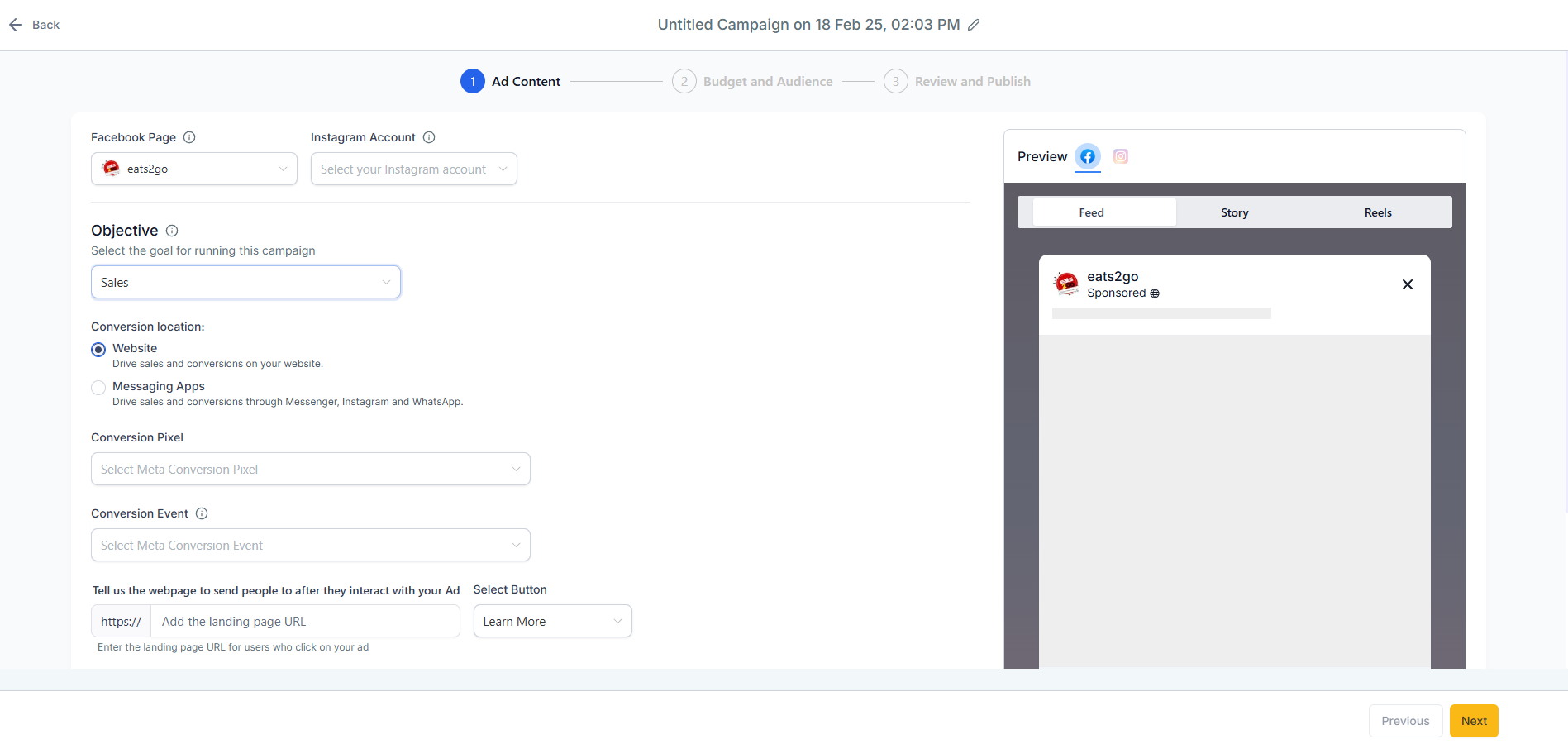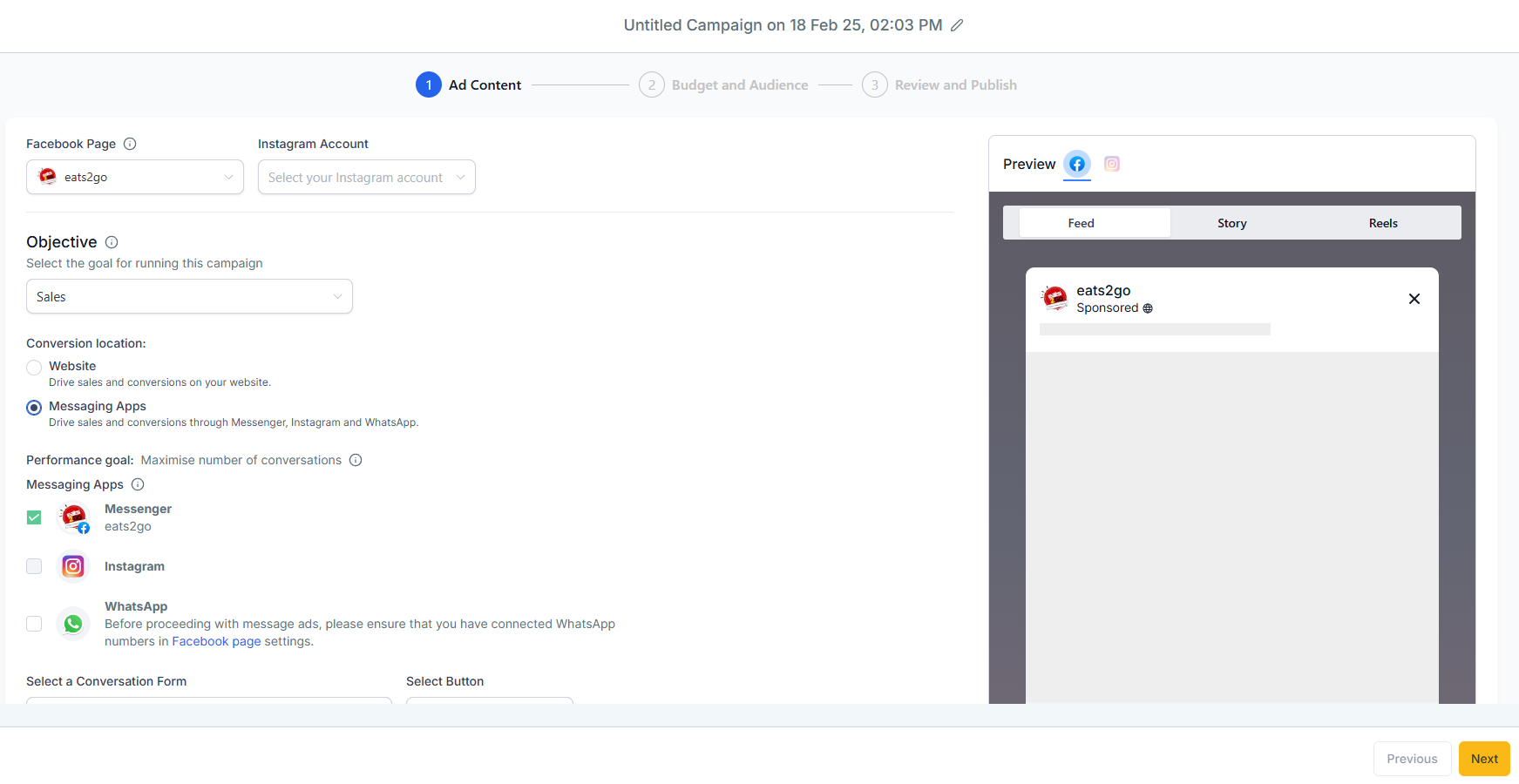 Select the conversion location to be either Website or Messaging Apps.