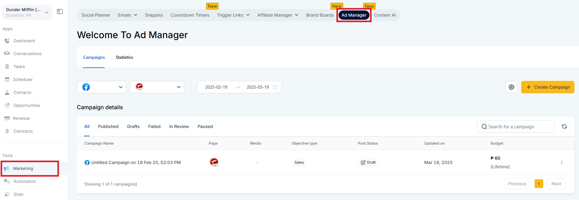 Navigate to Ad Manager through the Marketing section in your account and start a new campaign.
