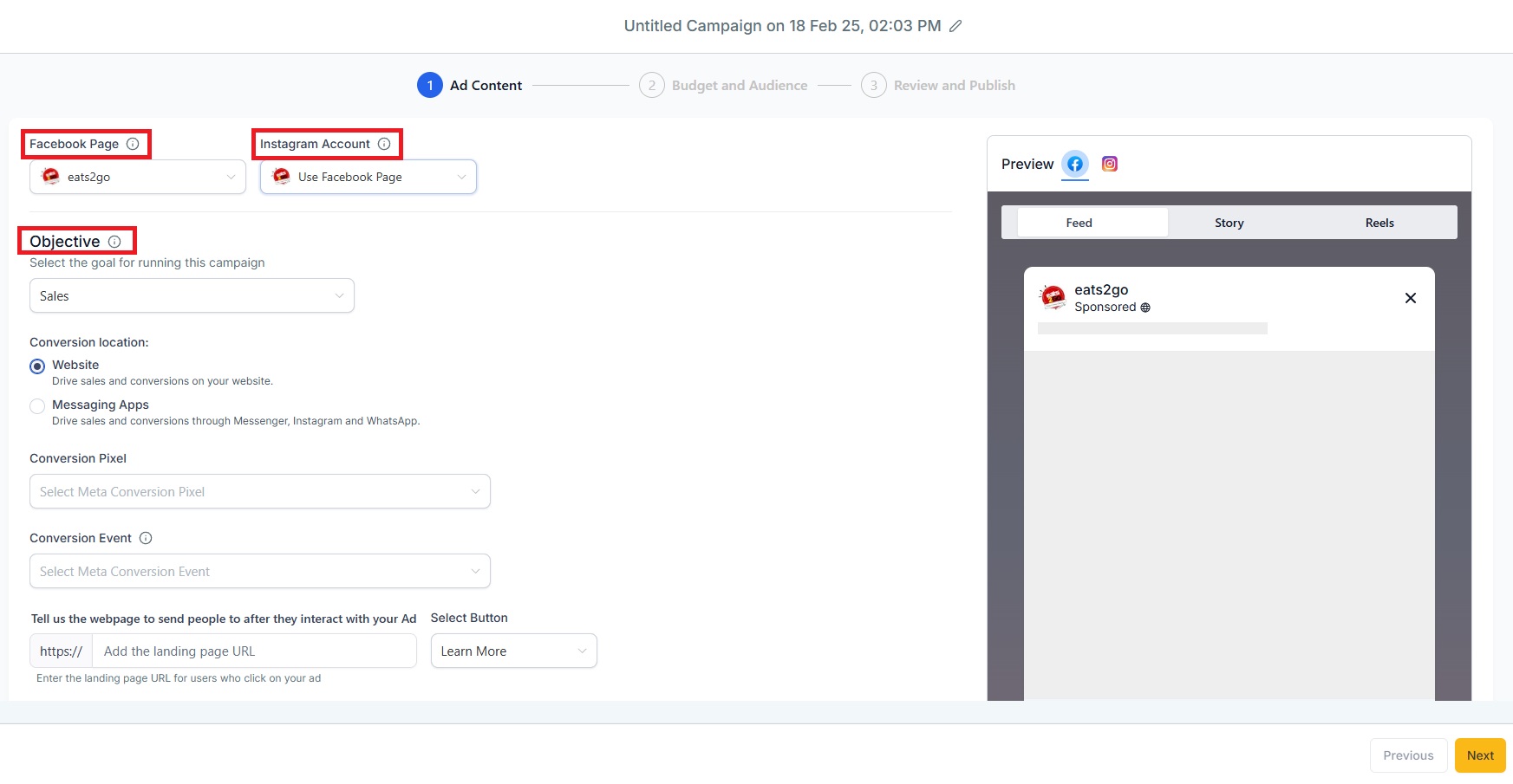 Choose the Ad Objective: Select Sales as the objective for the ad campaign.