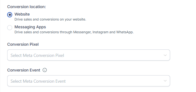 Select your conversion pixel, event(e.g., Purchase, Lead, Add to Cart) and define the Website URL or select the Messaging App for Website and Messaging Apps conversion location respectively.
