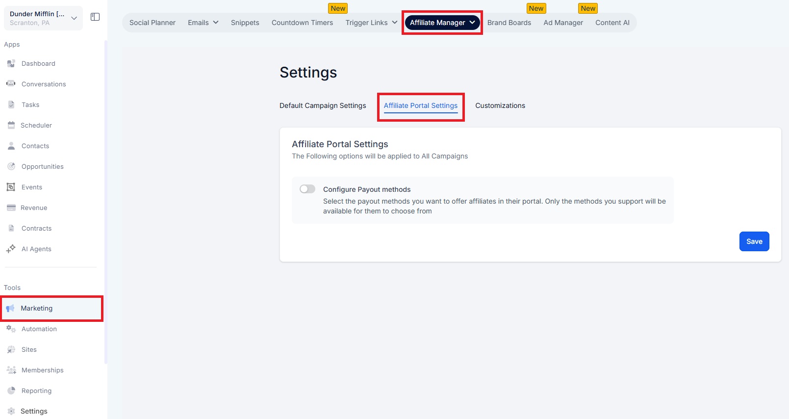 Click on Affiliate Portal Settings > "Configure Payout Methods"