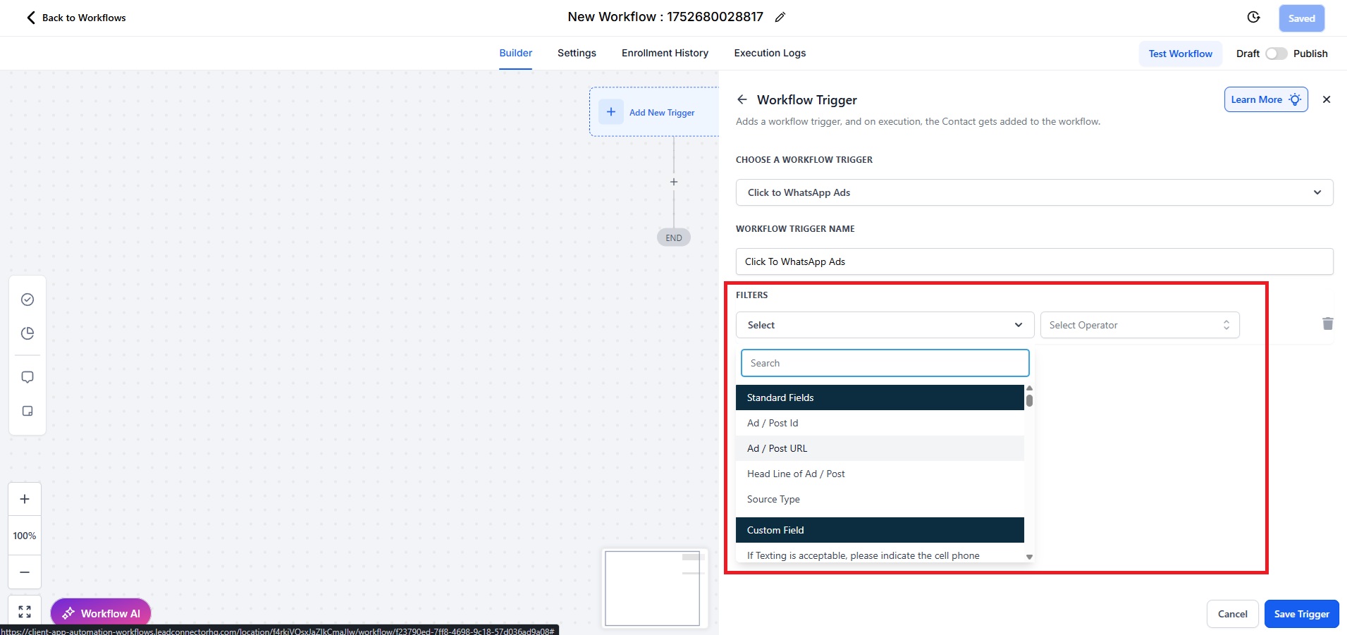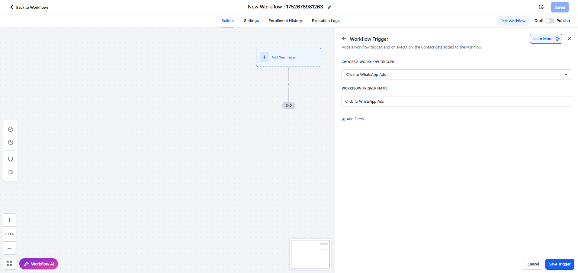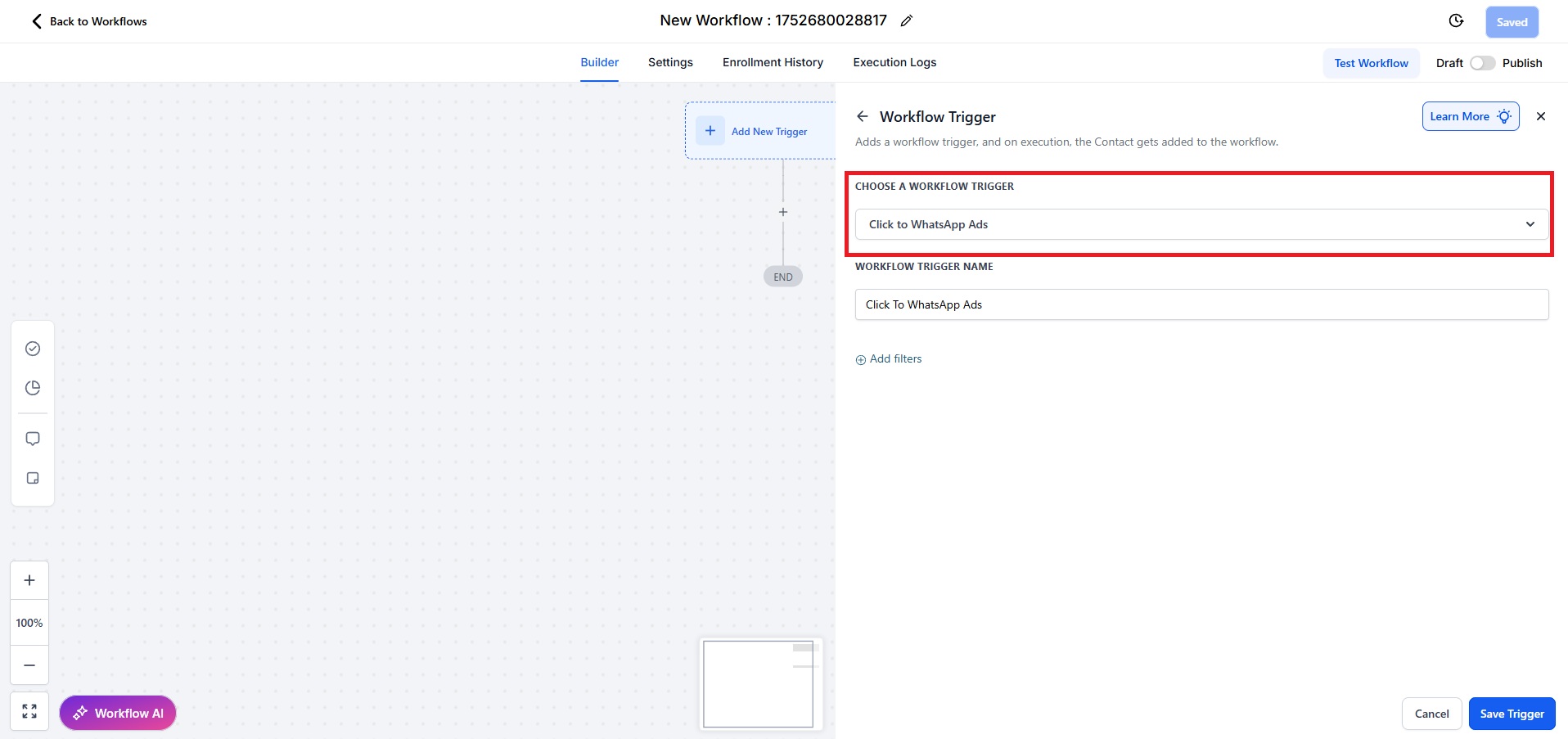 Save, then add the actions you want—send a message, assign a pipeline stage, fire a webhook, etc.