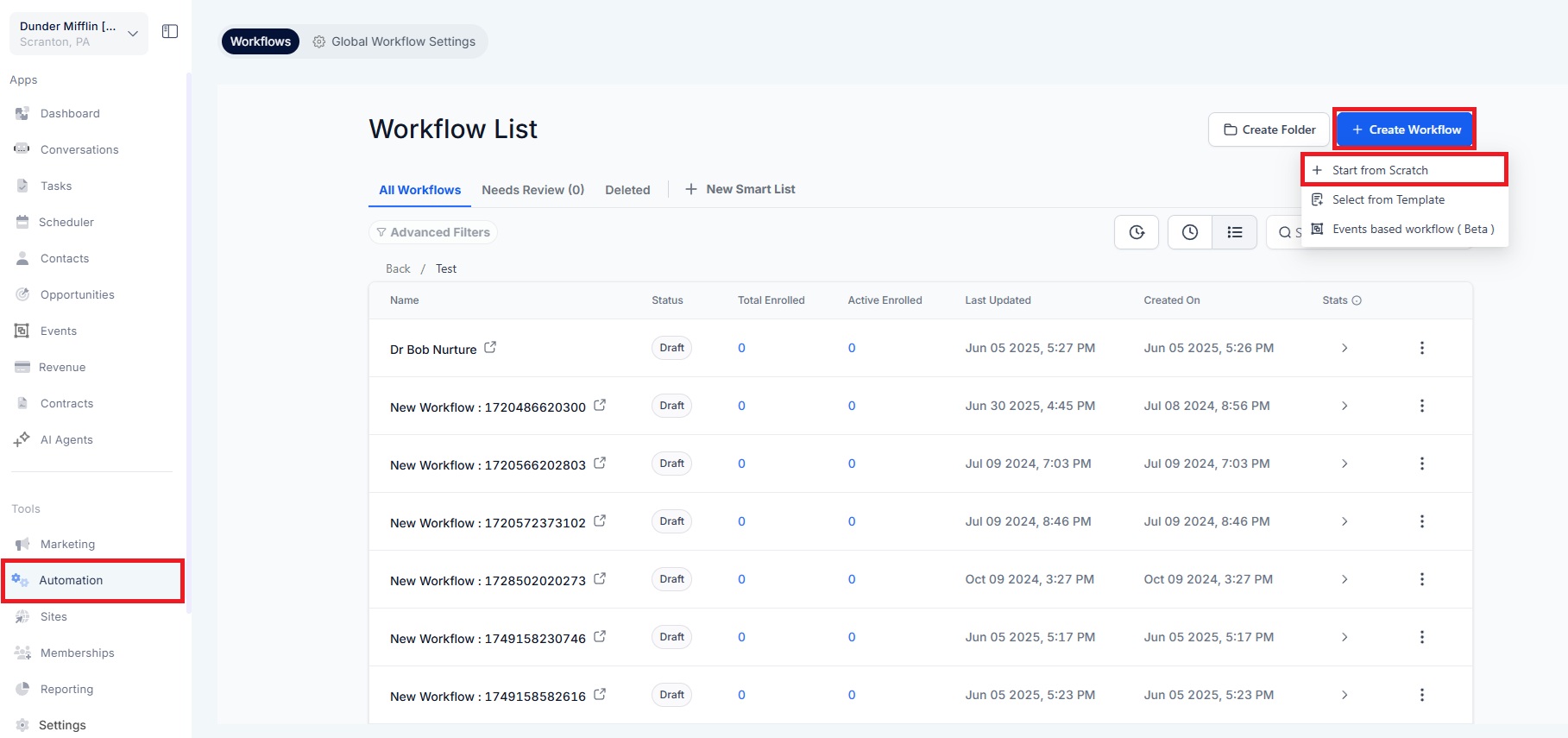 Navigate to Automation > Create a Workflow > Start from Scratch