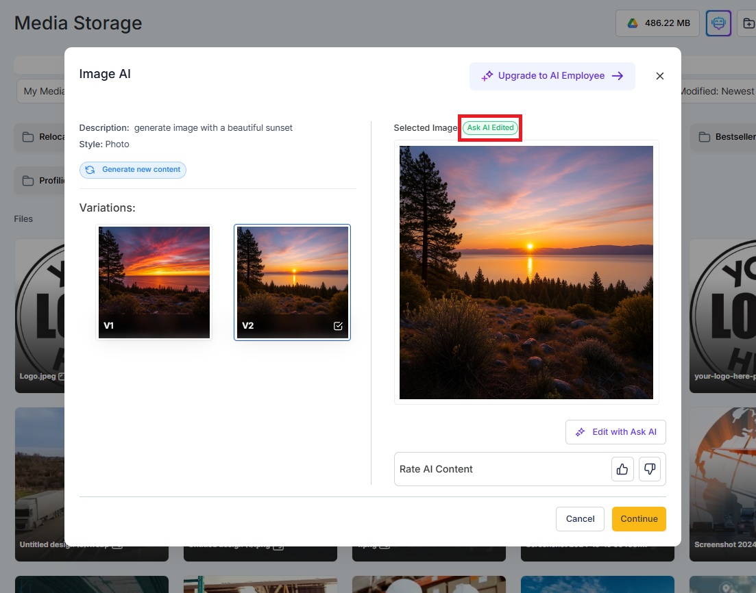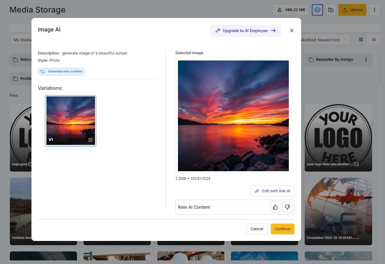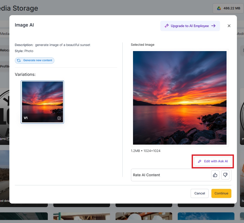 Click Use to send the final edited image back to the Content AI modal, or Save it to your Media Library for reuse.
