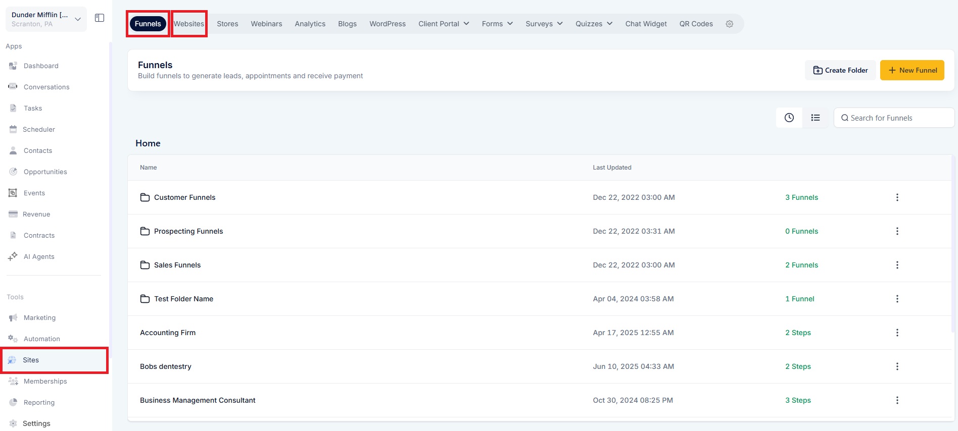 Navigate to Sites > Funnels or Websites.