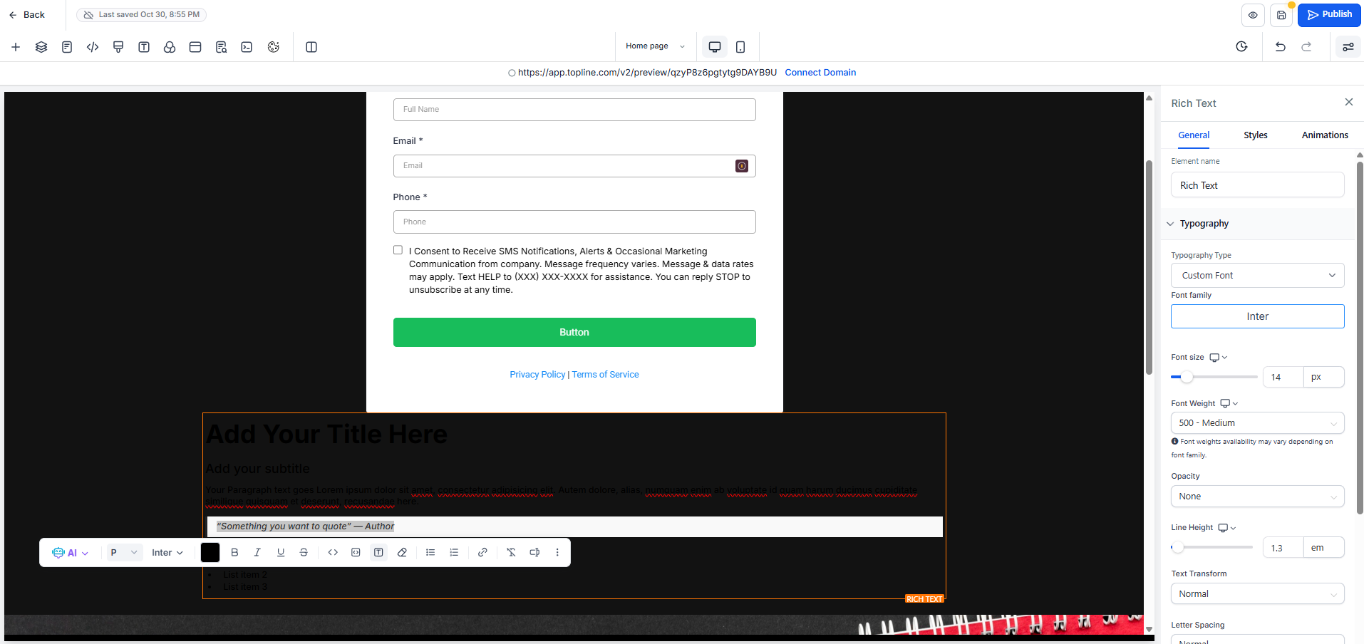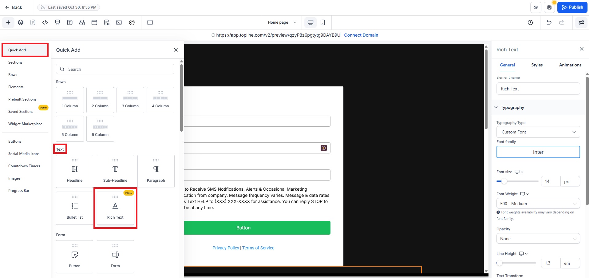 Open your Funnel builder and go to the Quick Add > Text section. Drag the “Rich Text” element into your page.