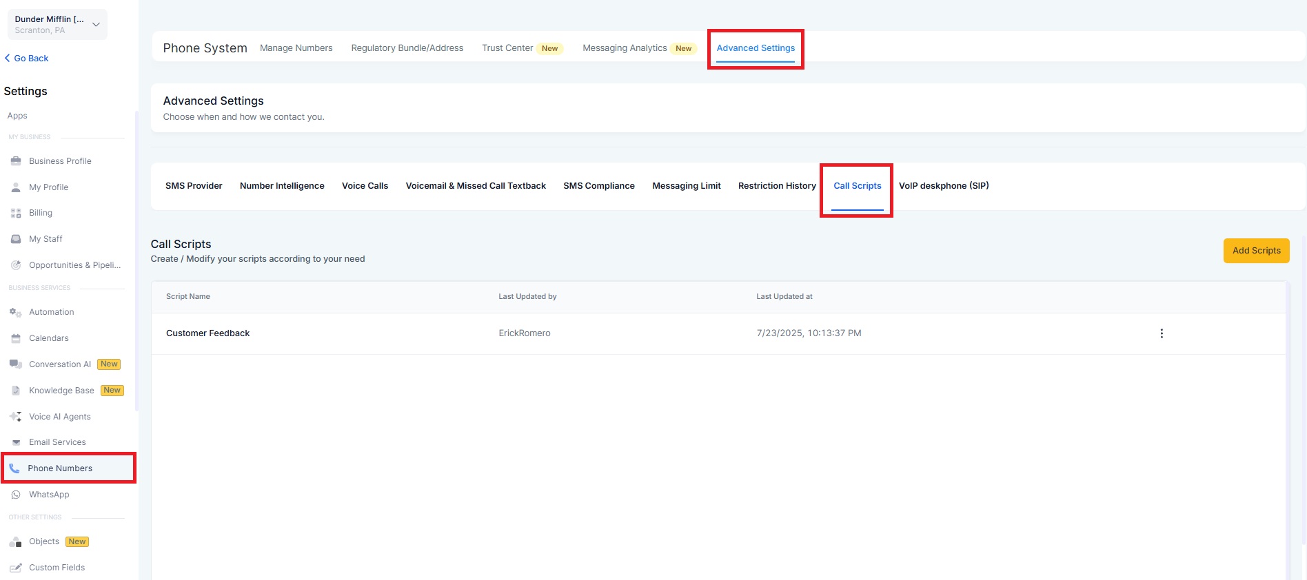 Navigate to Settings > Phone Numbers > Advanced Settings > Call Scripts