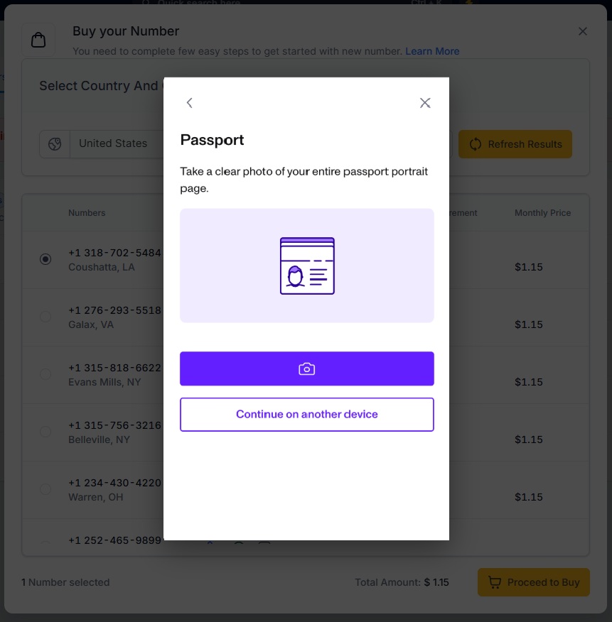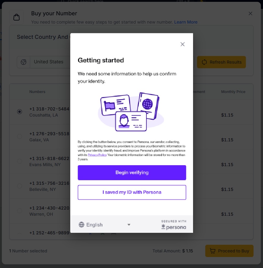 When a user attempts to purchase a US/CA/PR number and Persona hasn't been completed, the following identity verification modal appears.