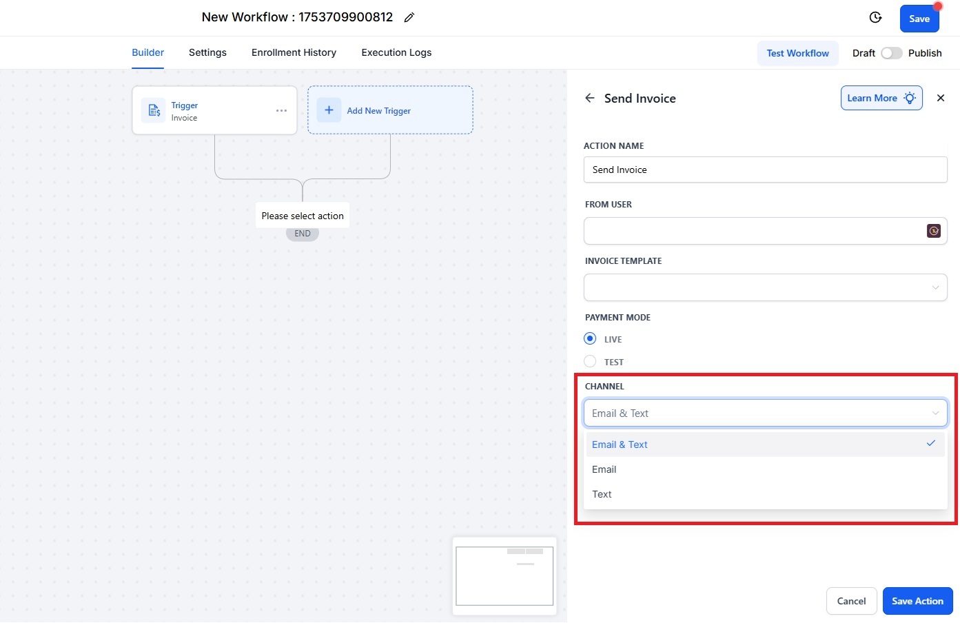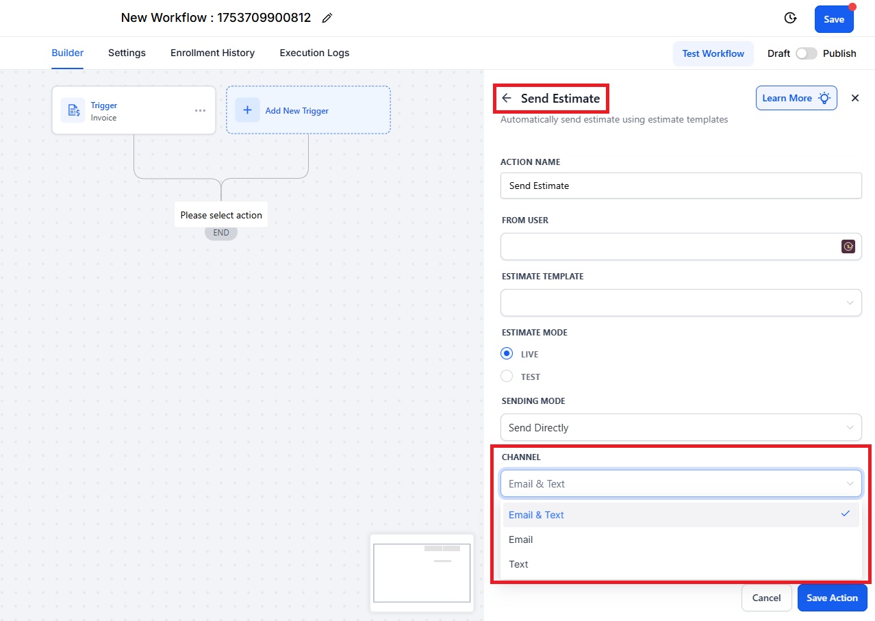 Open your Workflow in the Automation Builder and add (or edit) a Send Invoice, Send Estimate, or Send Recurring Invoice action. Scroll down to the Channel field highlighted below: