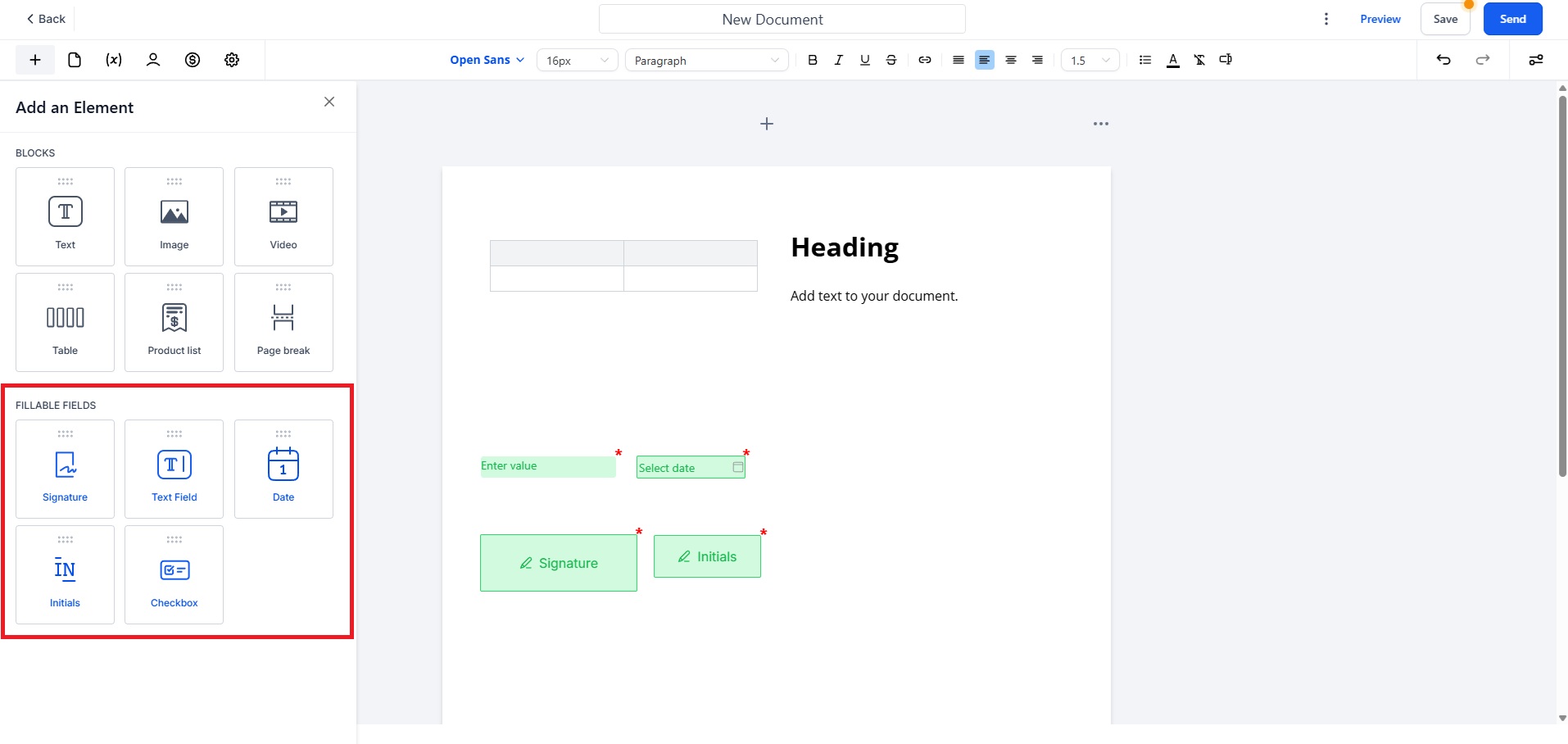 Place your fillable elements (input fields, checkboxes, date pickers, signature/initial blocks) anywhere on the page—even over long text blocks or tables that may break across pages.
