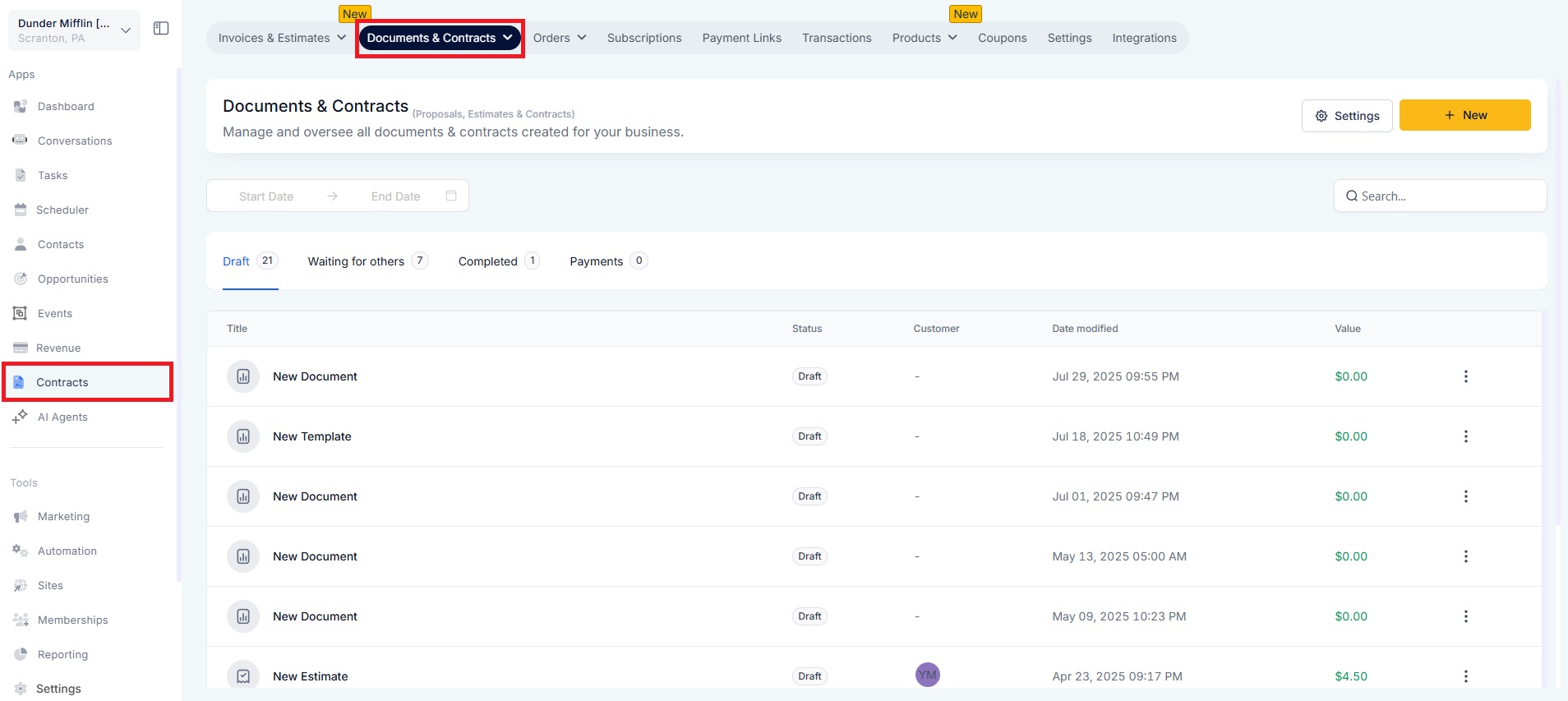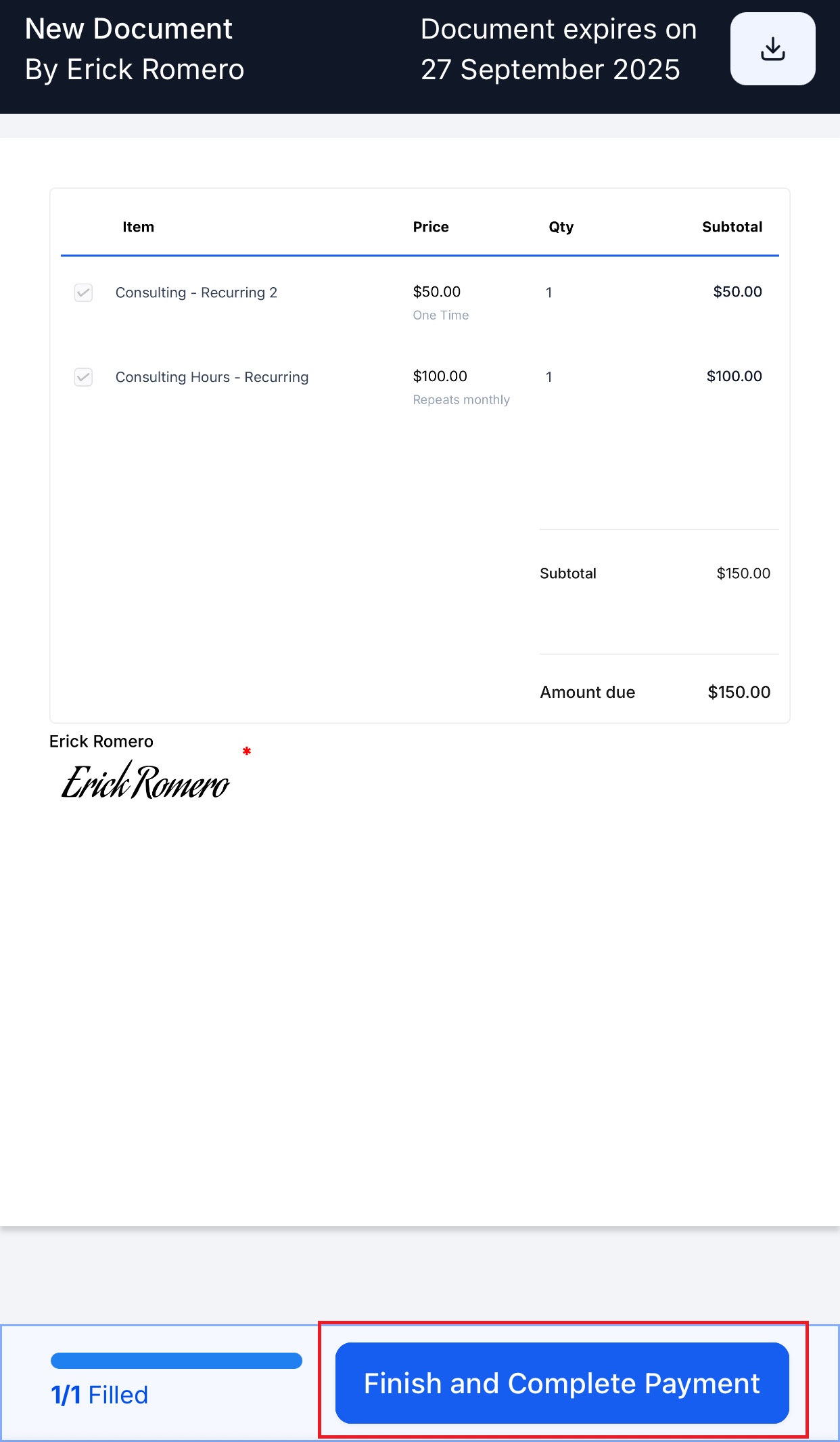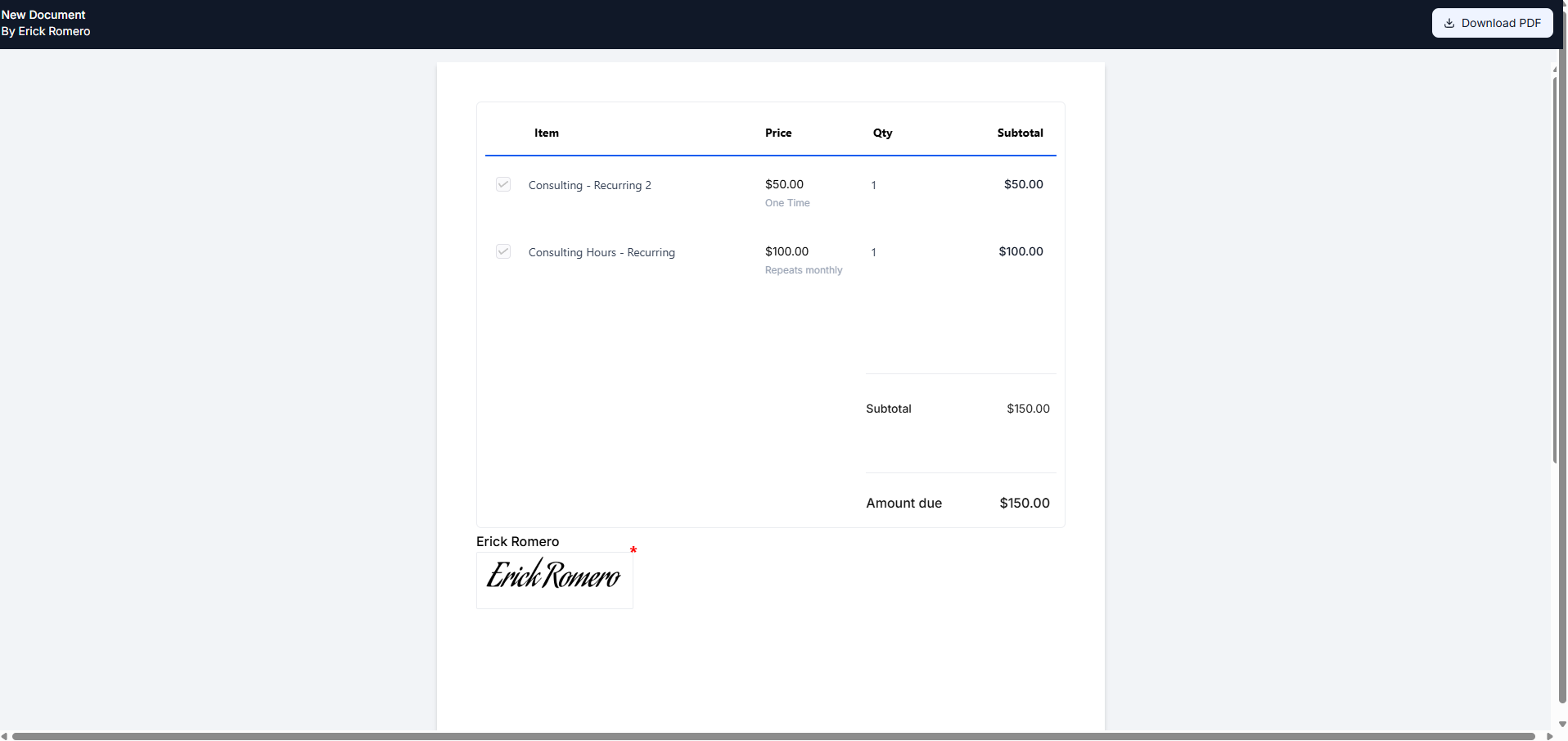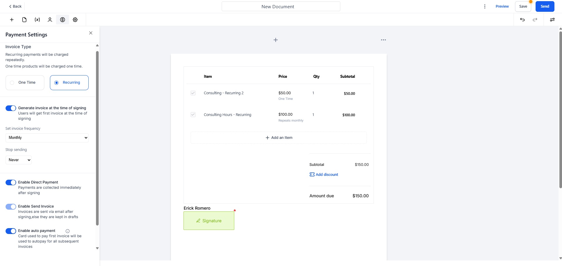 In your document, add recurring products as usual within a Product List. Enable direct Payments from the Payment Settings.