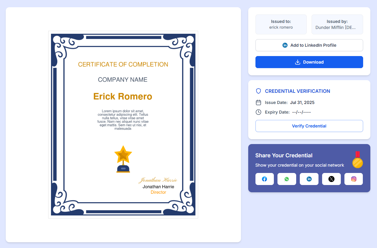 One-Click Sharing & Download – Instantly share your certificate on LinkedIn, WhatsApp, Instagram, X, and more — or download it with a single tap
