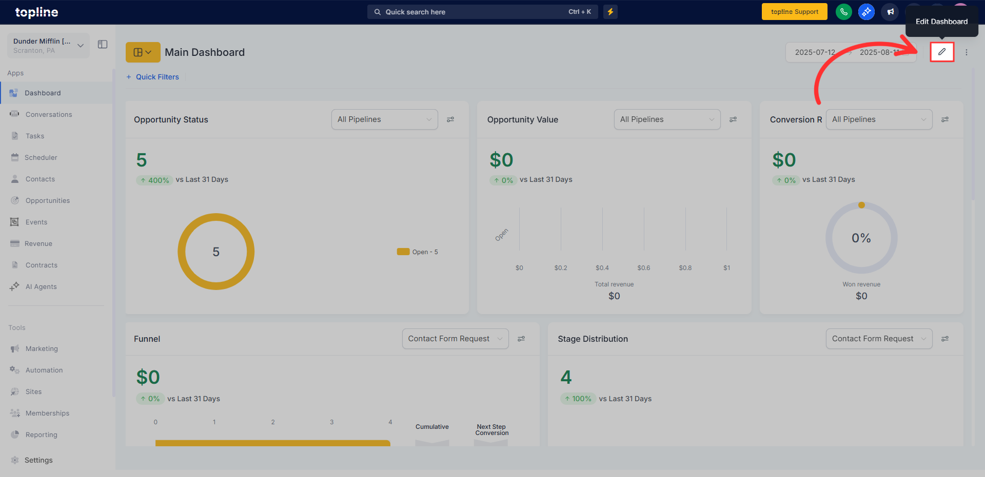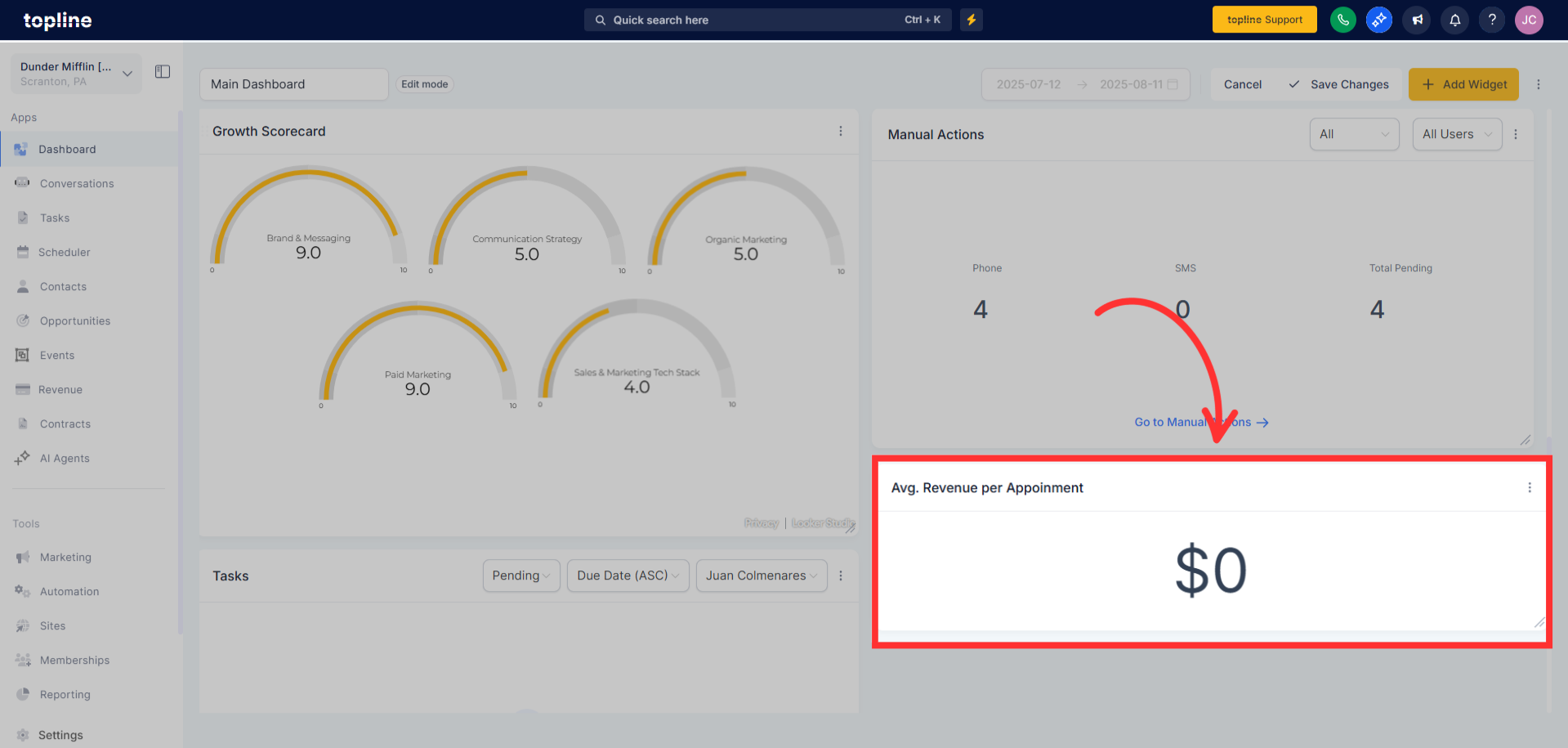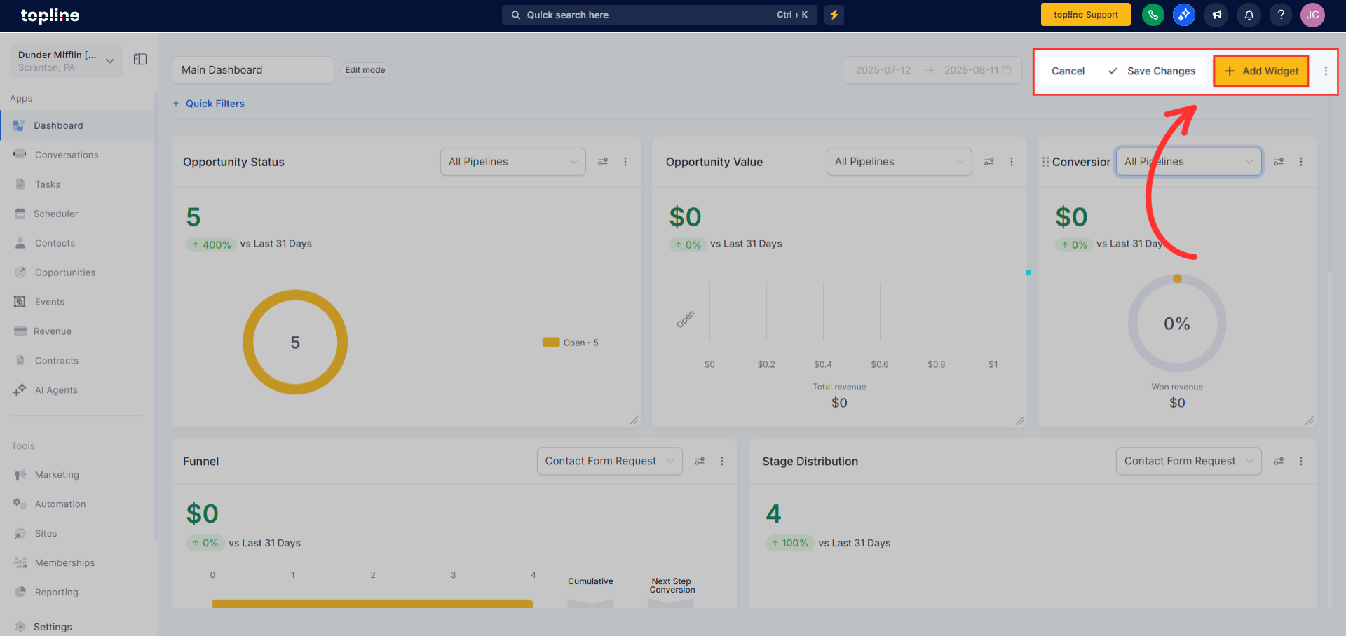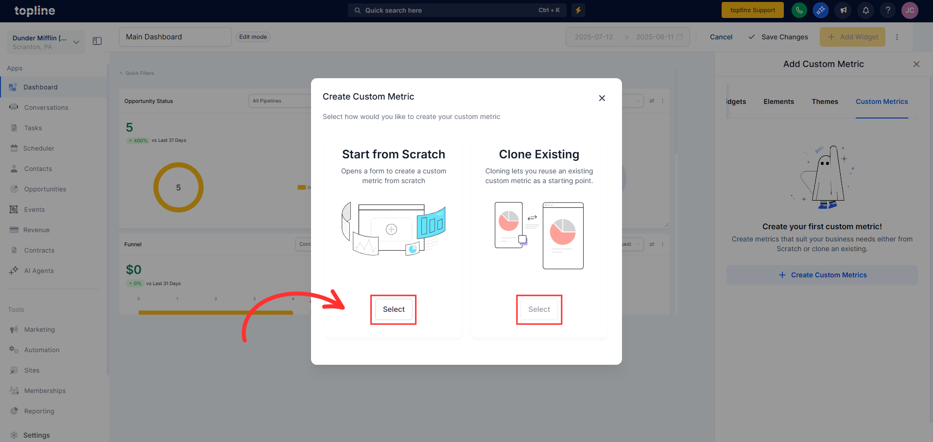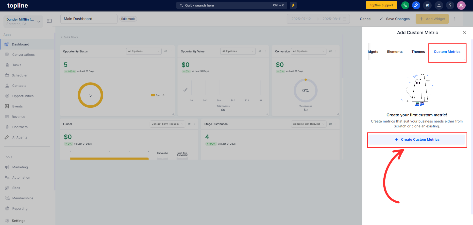 Custom Metrics let Topline OS accounts create their KPIs by combining numbers from multiple data sources (like Contacts and Opportunities), applying formulas, and dropping the result straight into Dashboards and Custom Reports. It’s snapshot‑compatible and designed to replace spreadsheet hacks, so teams can align on the exact definitions that drive the business.