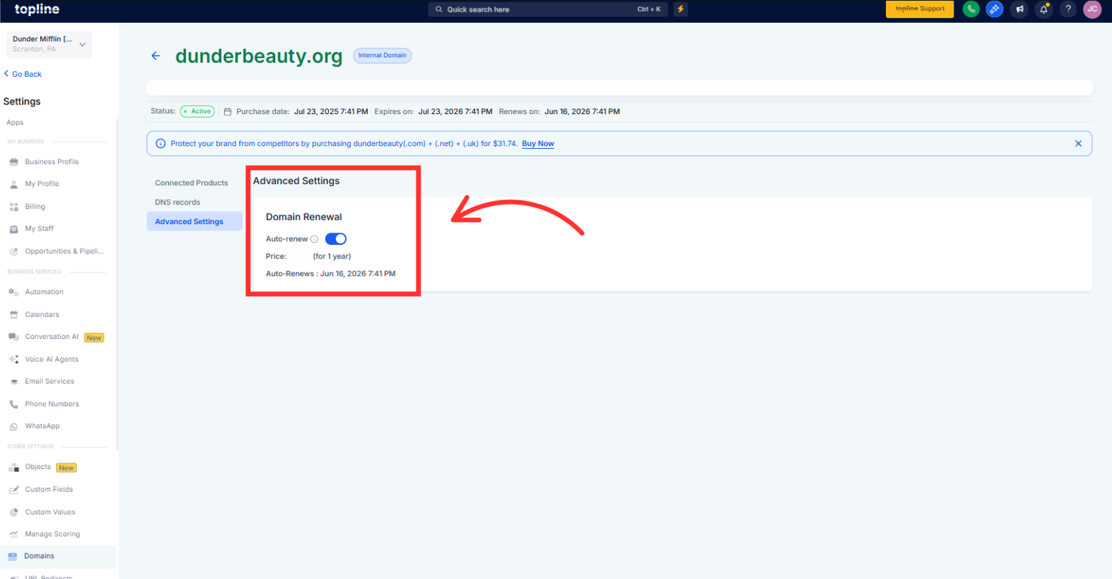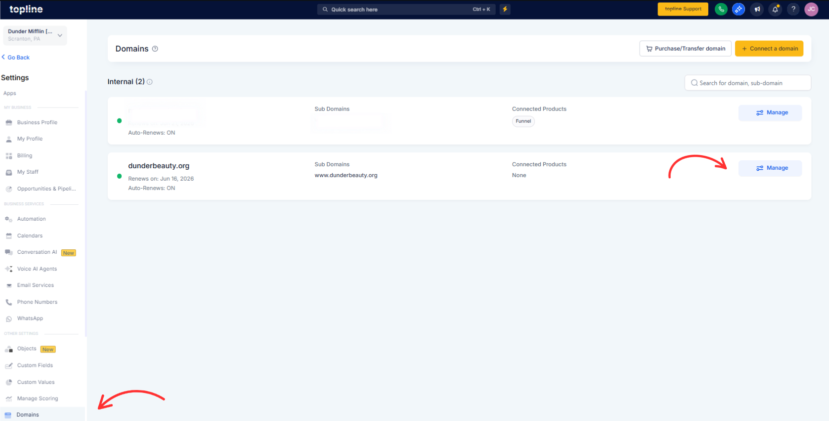 Go to Settings > Domains in your Topline OS account > Click on Manage