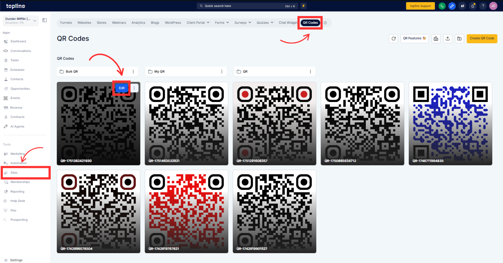 Open Sites > QR Codes and create a new QR code or open an existing one.