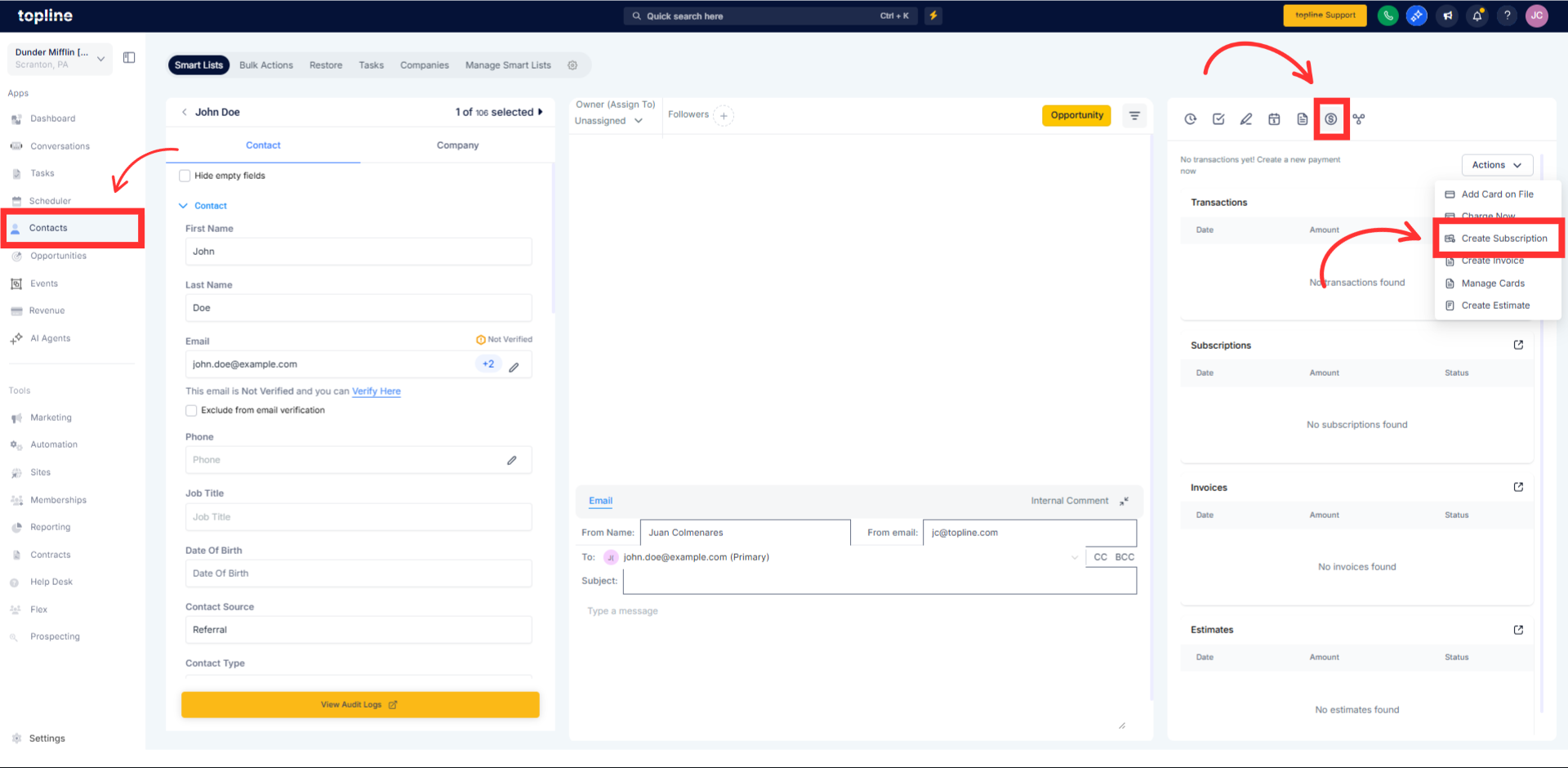 Find the contact, click on payment, then actions, and click on create subscription