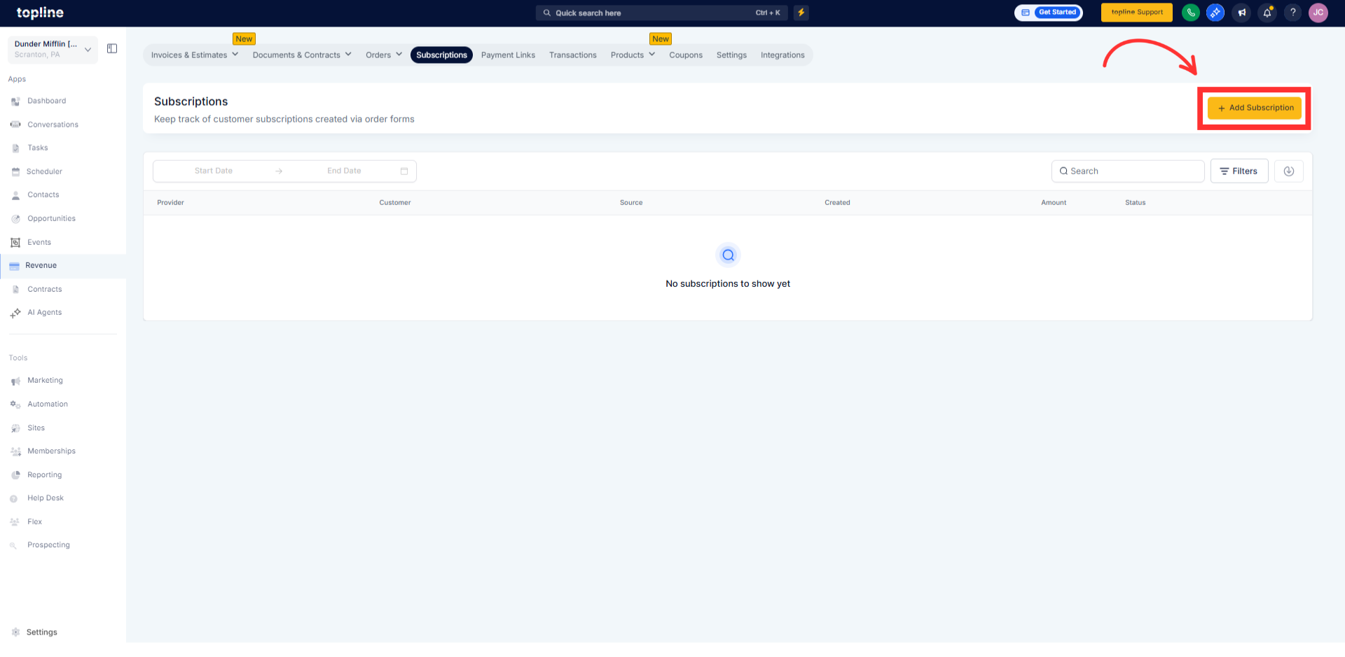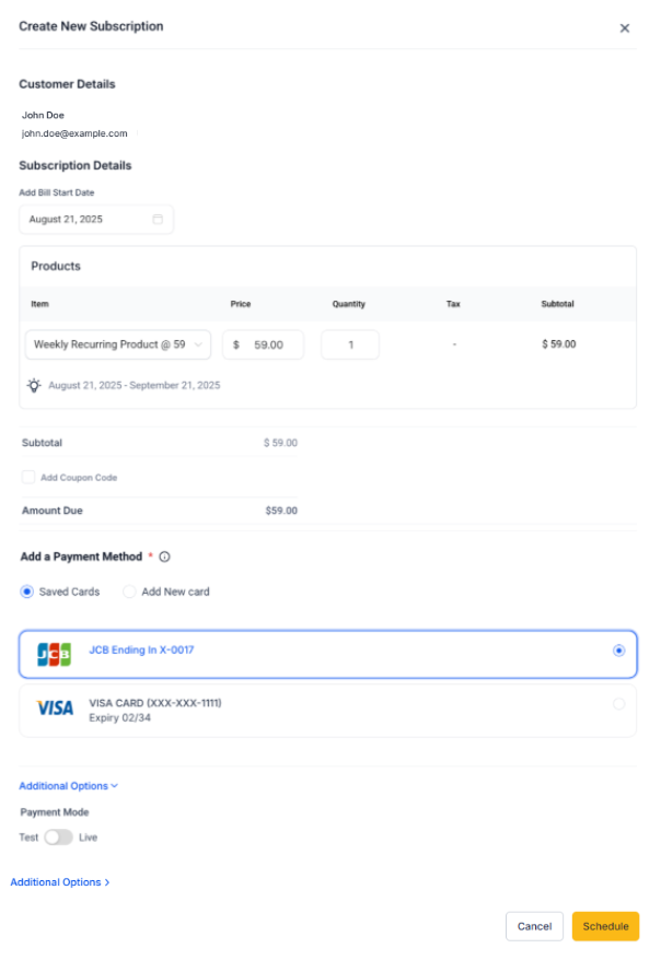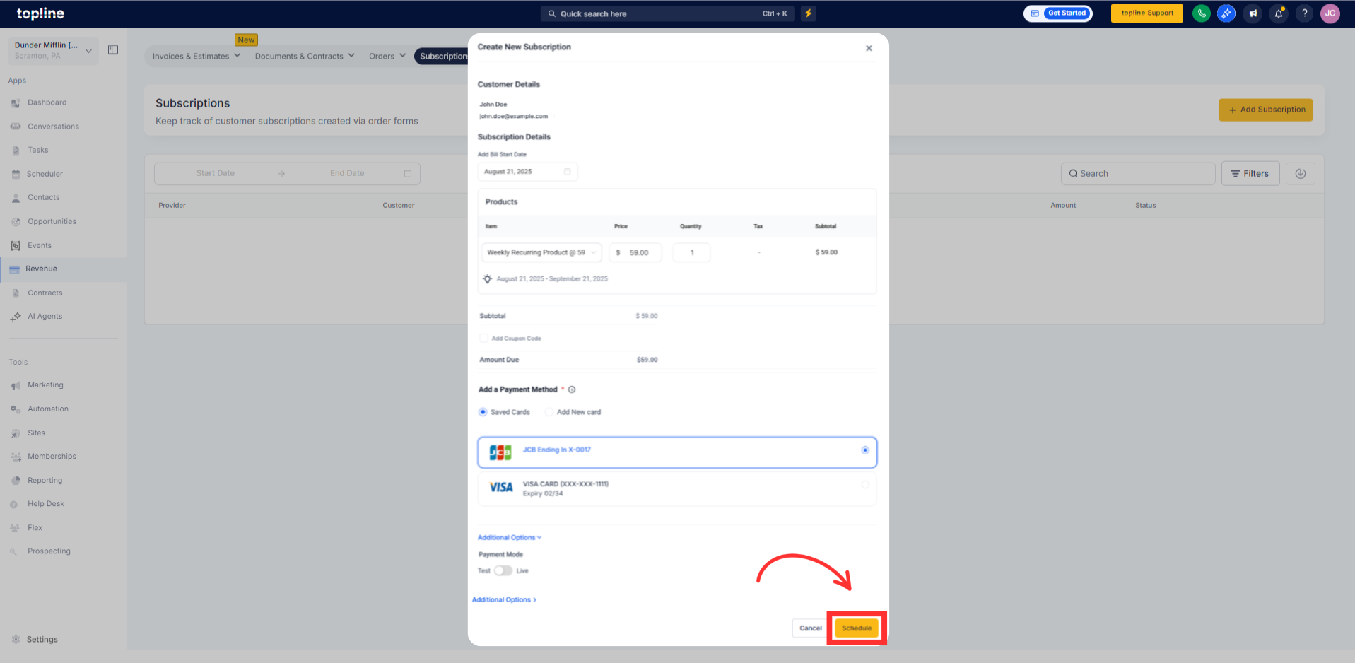 Set frequency, start date, amount/items, and save. Topline OS will charge the saved card on each cycle and Click on Schedule