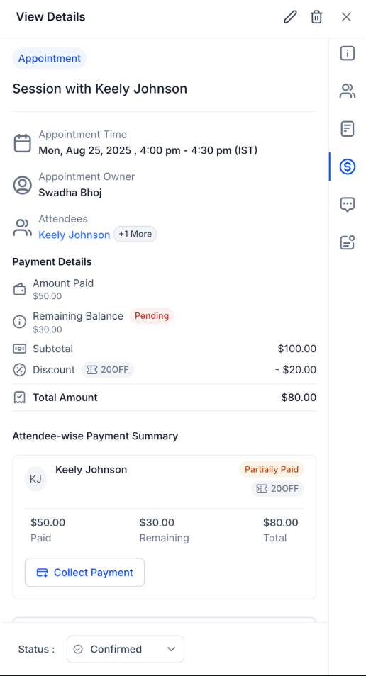 Enable coupons for a calendar, select which codes to apply, and your booking page will display a coupon field. Codes support percent or fixed discounts, date windows, and usage limits. Discounts appear on invoices and receipts.