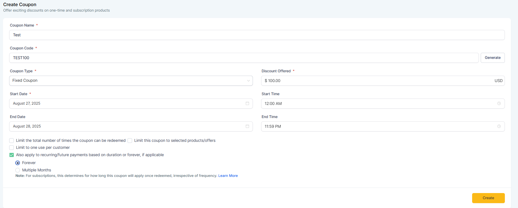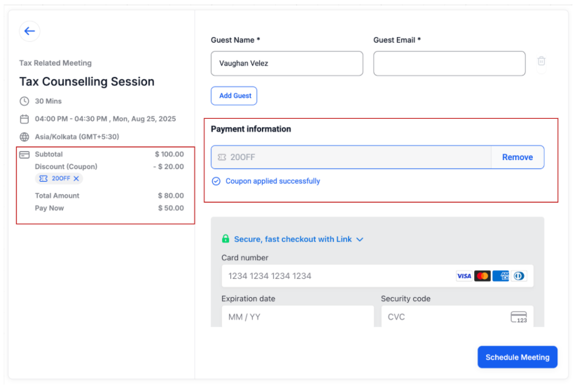Run a test booking, apply the code, and verify the discounted total, invoice, and receipt.