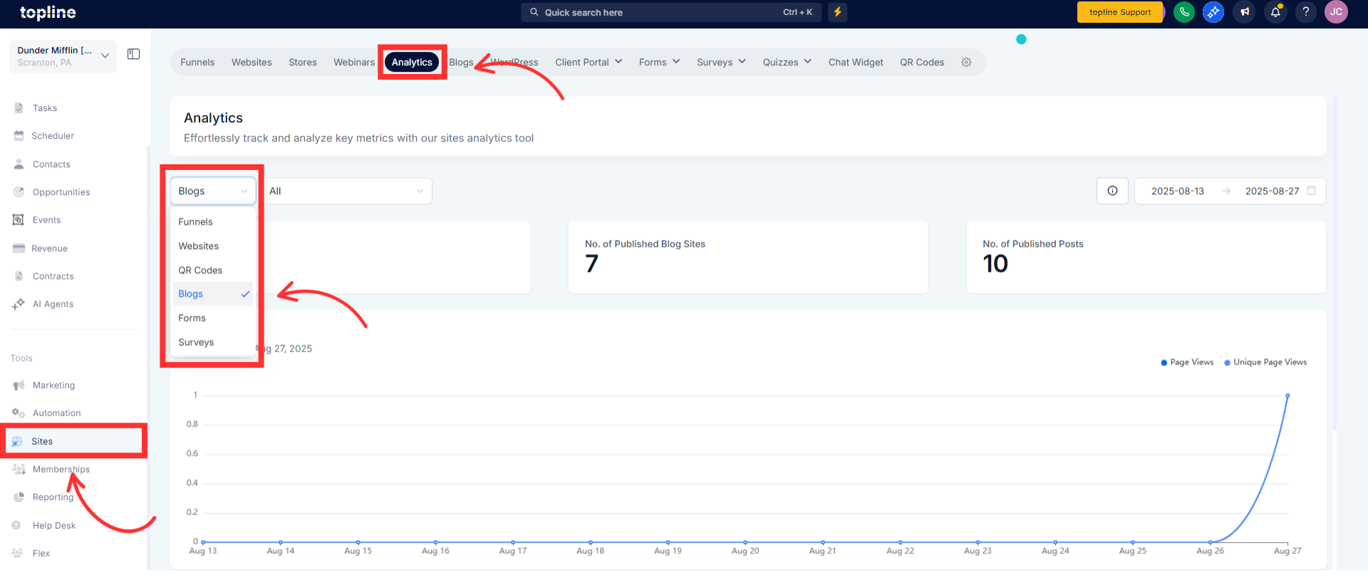 Topline OS adds blog statistics so you can monitor views, spot trending posts, filter by date range, and export results for reporting. Use it to learn what readers engage with and improve future posts.