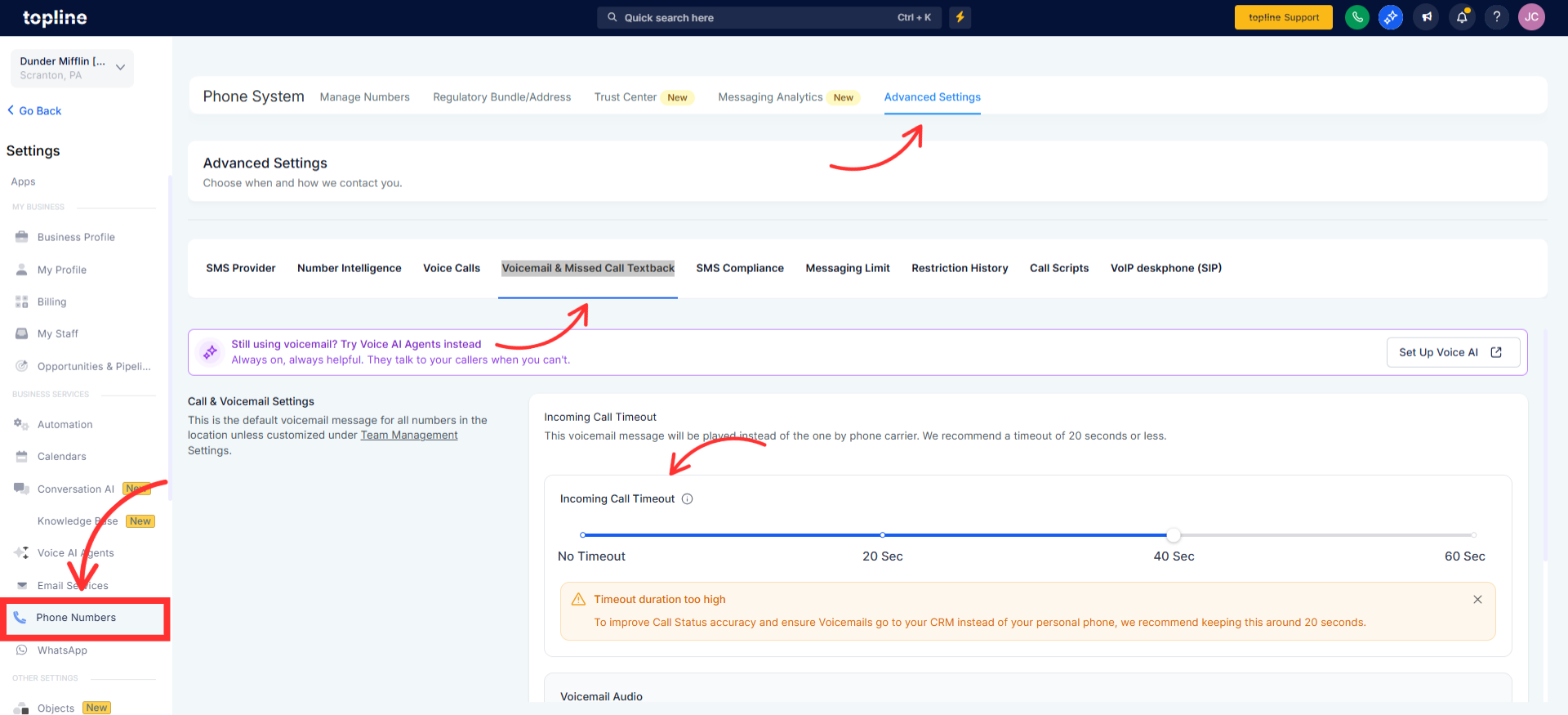 Topline OS now guides you to set a healthy incoming call timeout. You will see a recommended range, inline warnings for risky values, and simple testing so callers reach your team or voicemail at the right time.