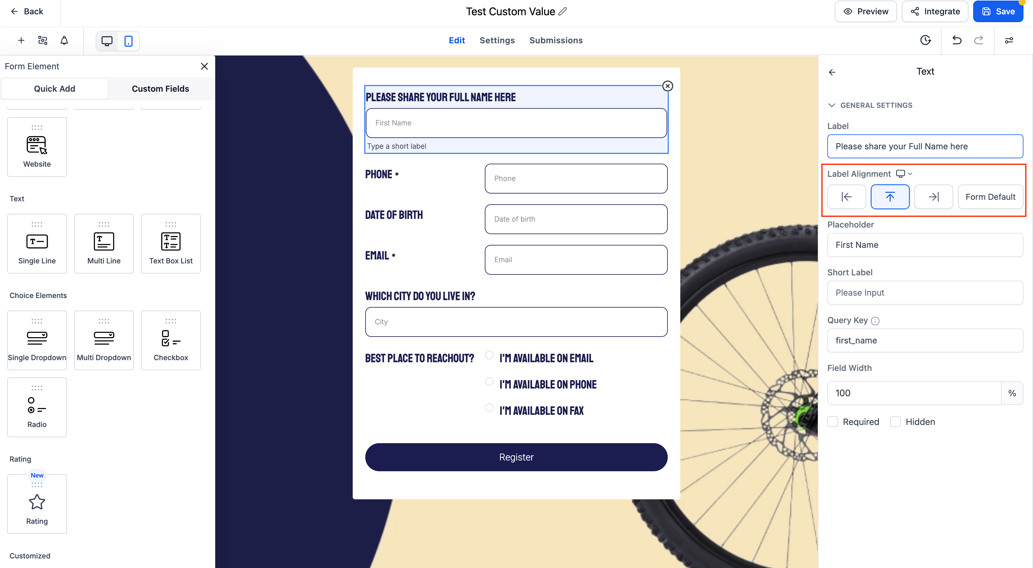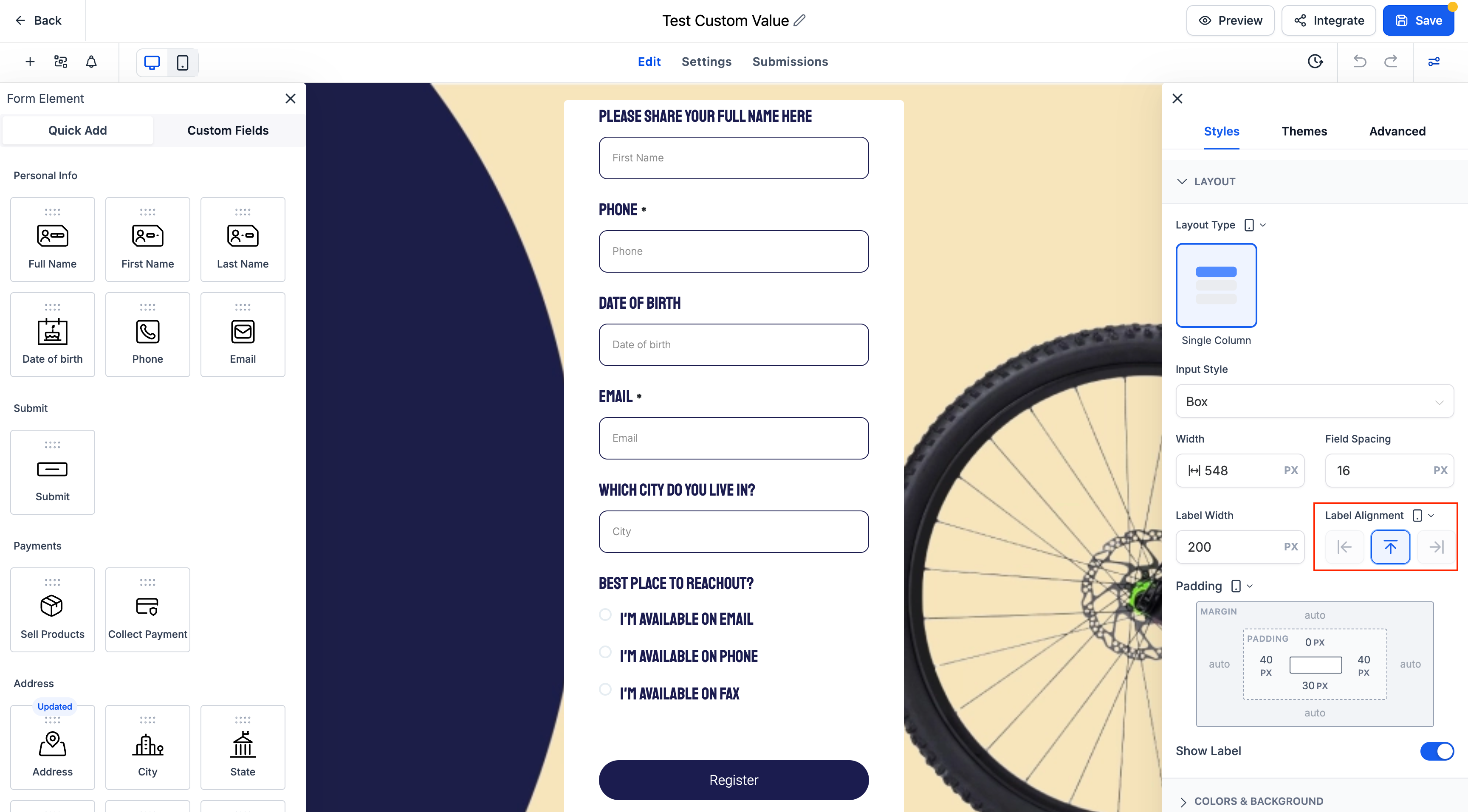 You can now set label alignment per element in the Forms and Surveys builder. Override the form default on any field, choose top, left, right, inline, or hide the label, and keep layouts consistent on desktop and mobile.