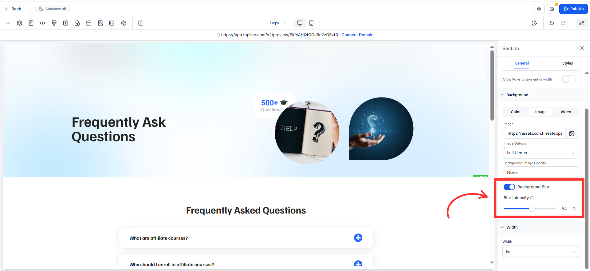 Topline OS now includes gradient blur backgrounds in the Page Builder. Pick a preset or customize colors, angles, blur strength, and placement to create depth and focus behind your content.
