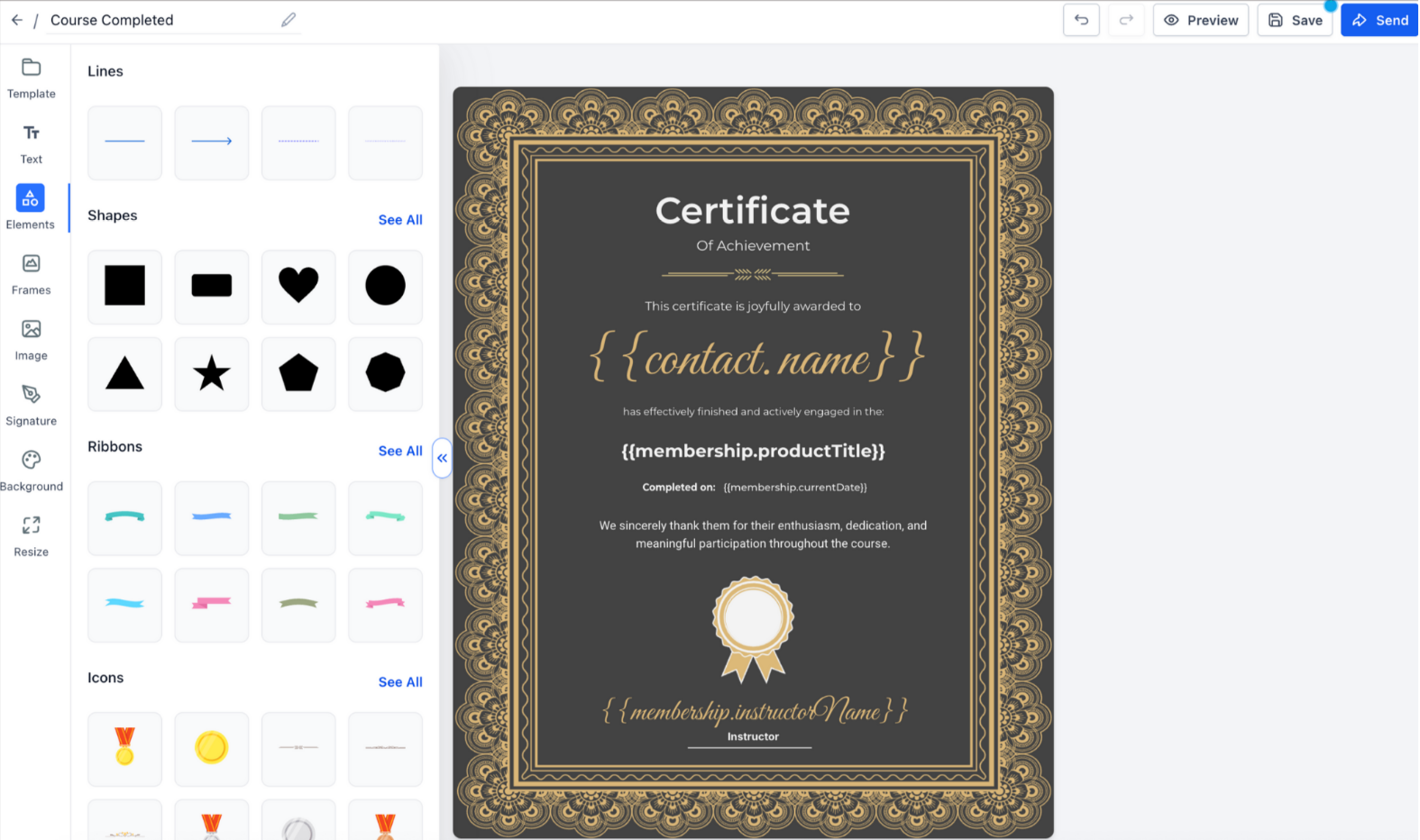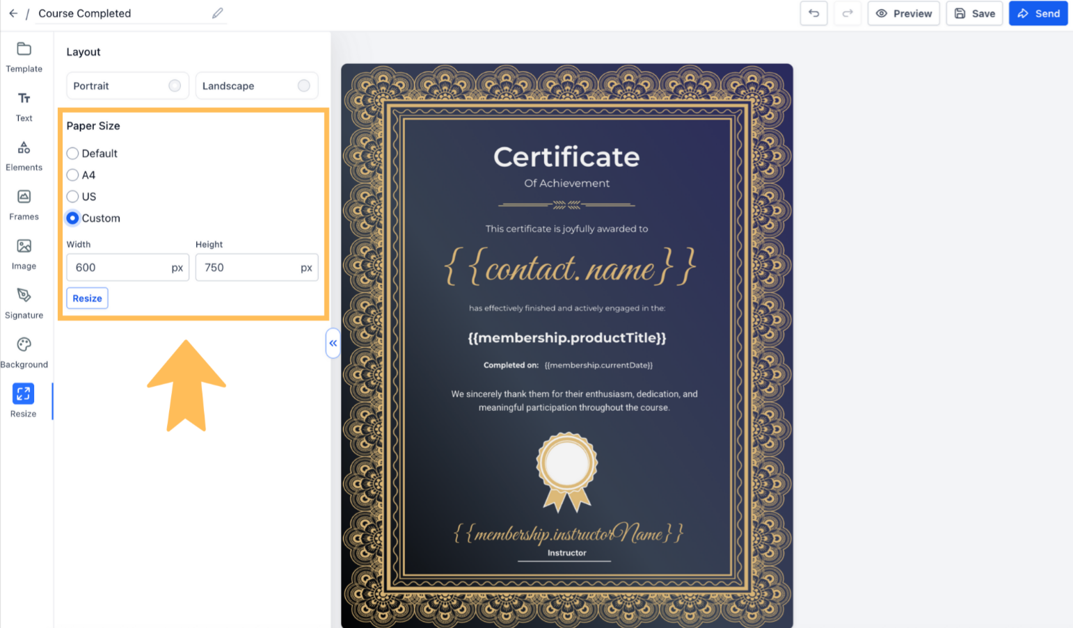 Choose a size and orientation, then add your logo, background, and brand fonts and colors. Insert dynamic fields such as Recipient name, Program title, Completion date, and Certificate ID. Position and size them.