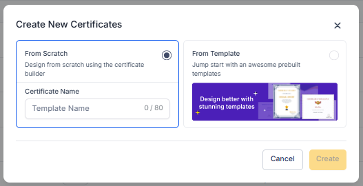 Drag and drop certificate builder with layouts, backgrounds, fonts, and brand colors