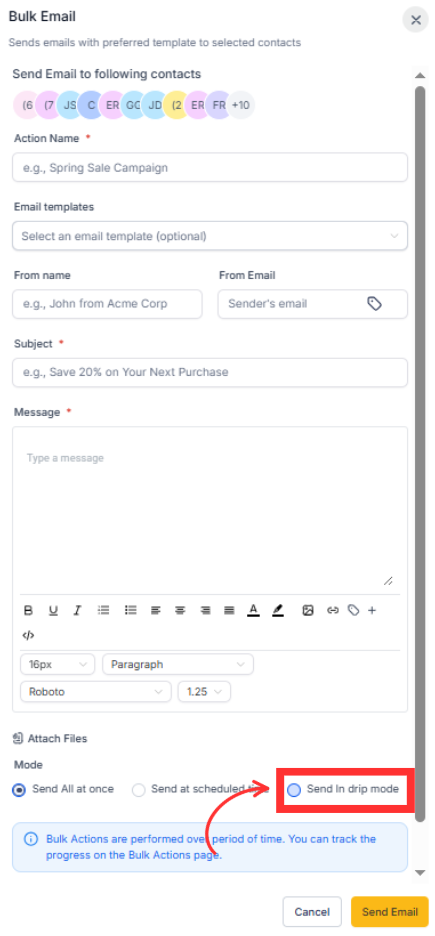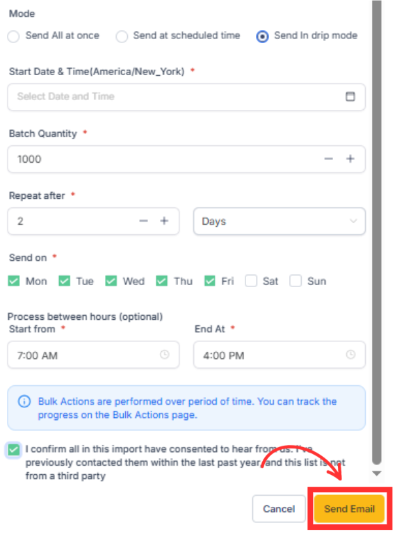 Compose the message and set schedule details. Choose drip mode if available and keep defaults for adaptive pacing.