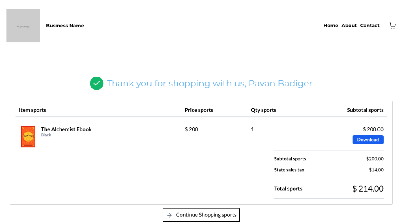 Place a test order, open the confirmation and receipt, and click Download. Verify the button state and access rules.