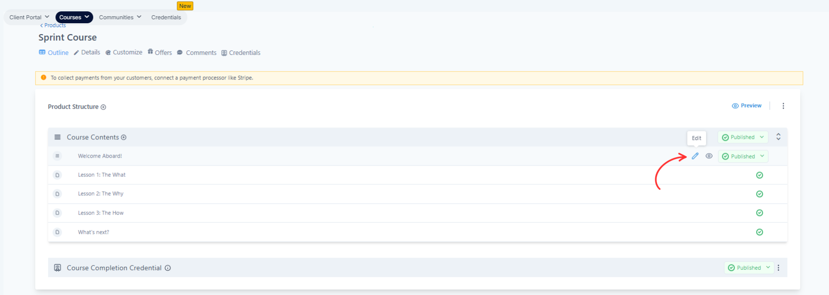 Use preview to run the full learner journey: enroll, open lesson, watch video, complete quiz, check progress