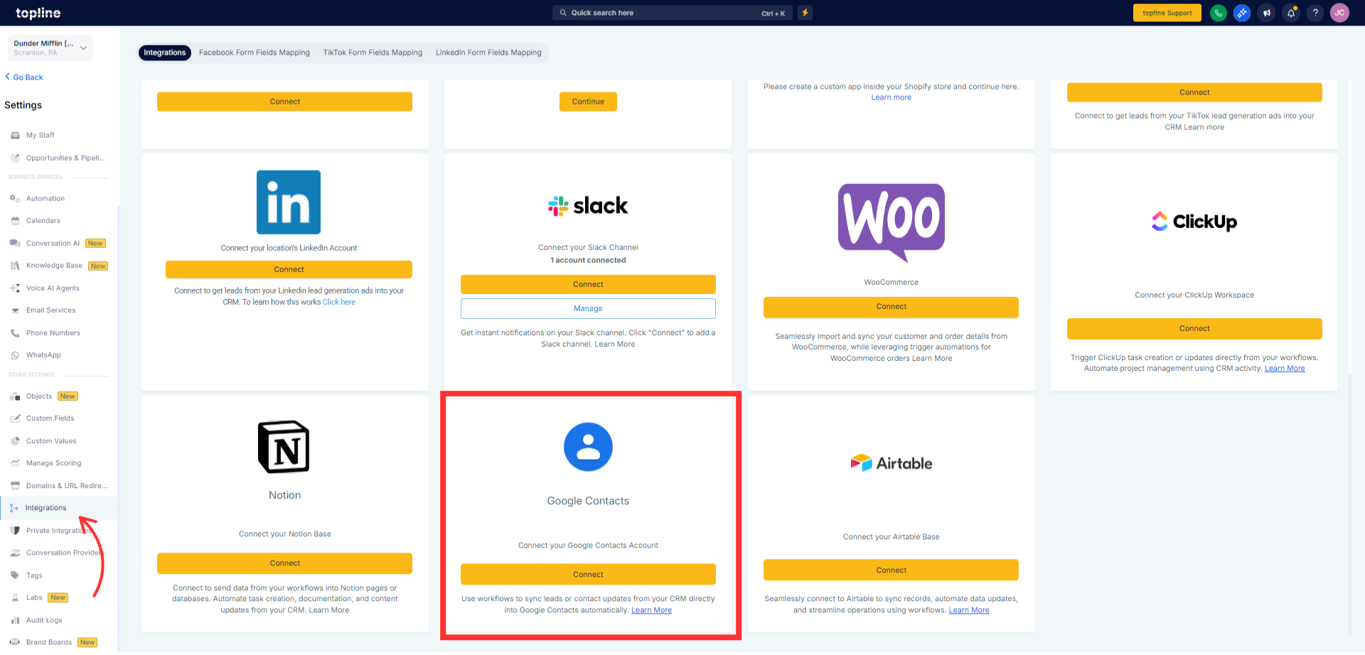 Topline OS adds native Google Contacts triggers and actions in Workflows. Connect your Google account, map fields, and automate tasks like creating or updating Google Contacts from Topline OS changes, or triggering workflows when a Google contact is added or modified.