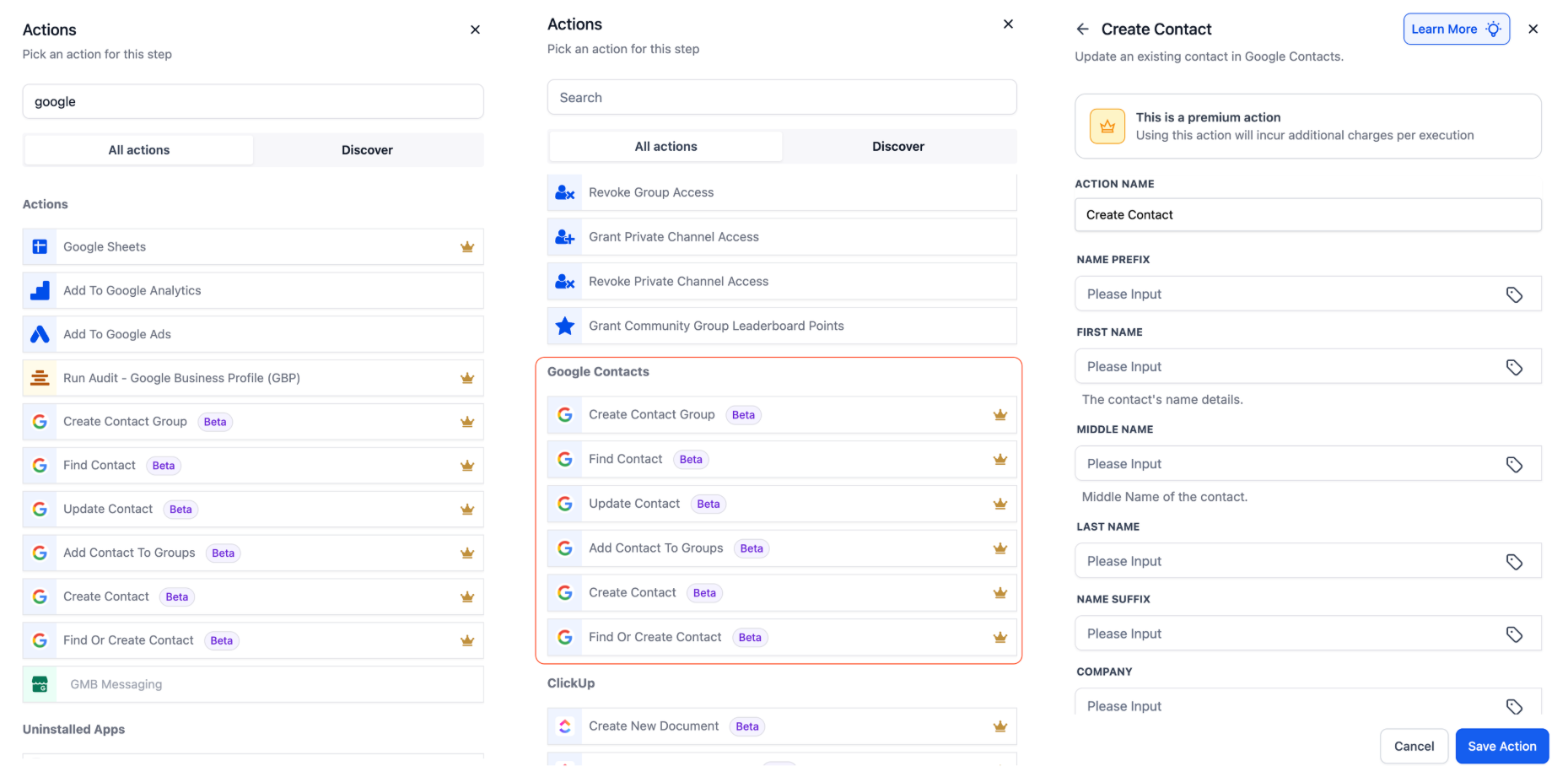 In Workflows, add a Google Contacts trigger such as Contact created or Contact updated, or add an action like Create contact or Update contact.