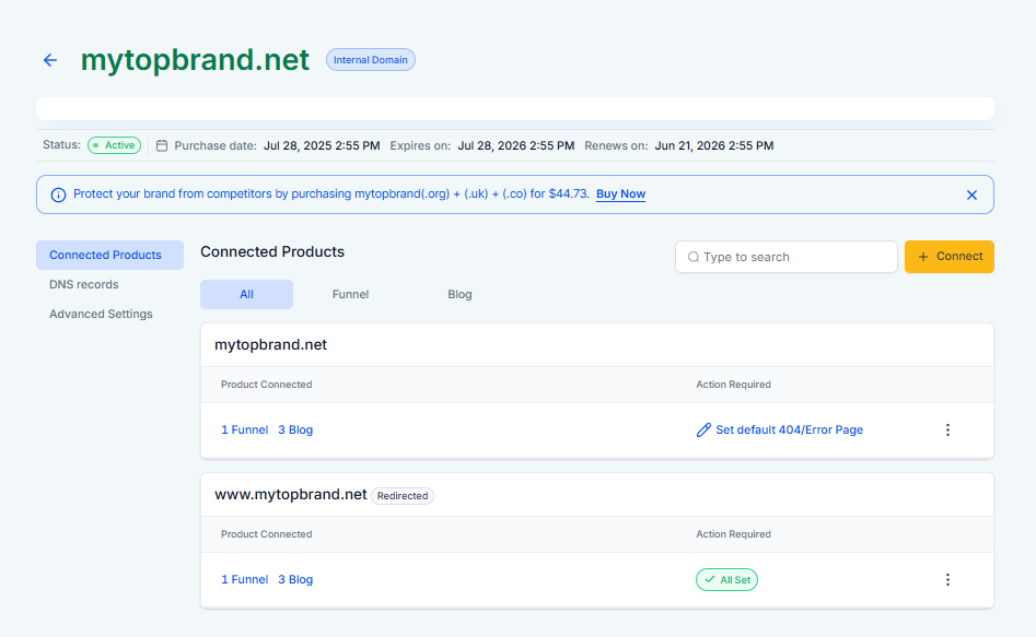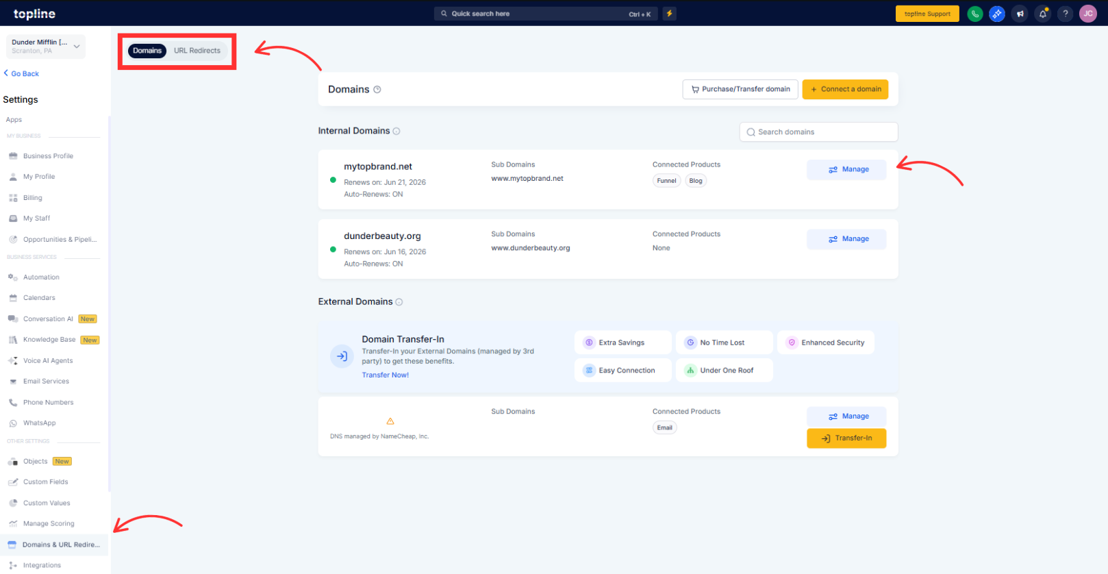 Topline OS updates the Domains page with a modern design and better organization. You can scan domain status at a glance, jump into DNS or redirects faster, and handle renewals with fewer clicks.