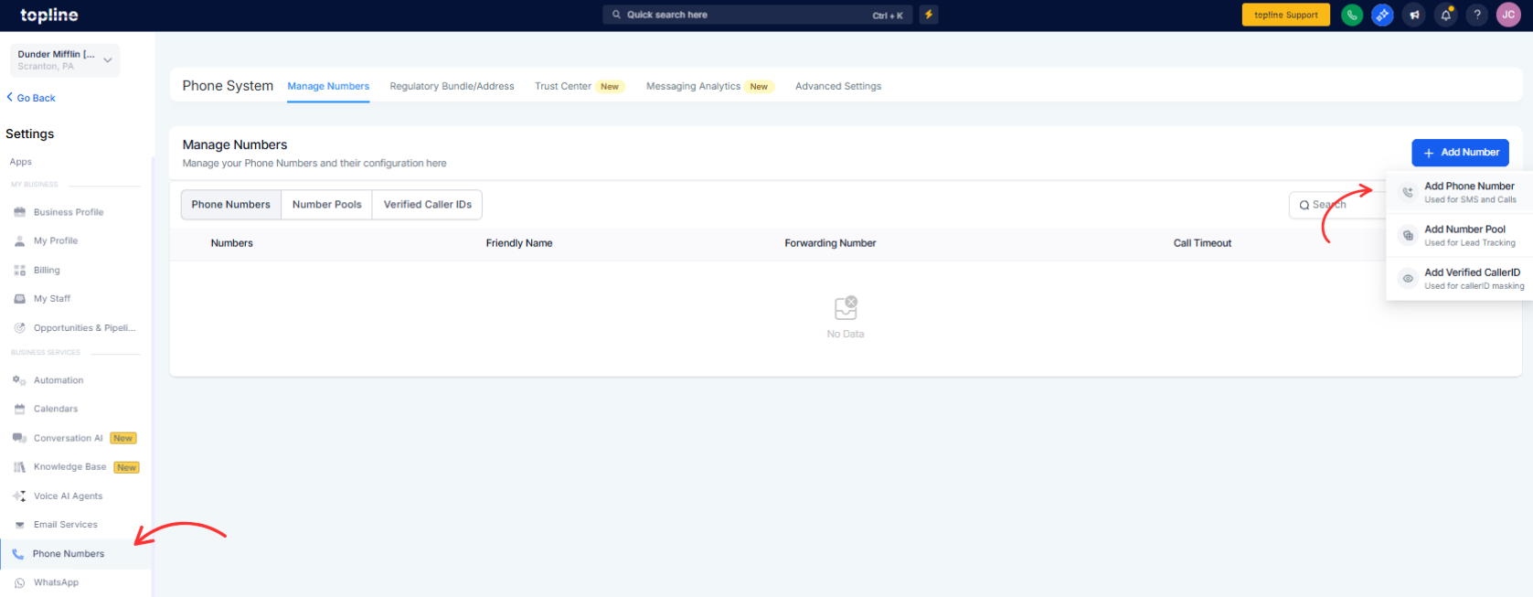 Topline OS expands phone number coverage with additional countries and new number types. You can search and purchase more local, national, mobile, or toll-free numbers, then assign them to calling and messaging with the same simple setup.