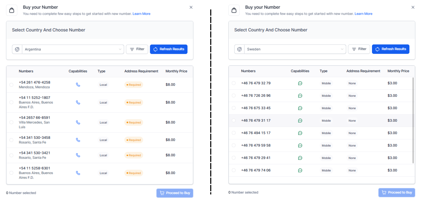 Select the target country and choose a number type, for example local, mobile, national, or toll-free. Search by area code or city where available and review capabilities like voice and SMS. If you plan to send SMS, complete required registrations, for example A2P or sender IDs, then test a call and a text.