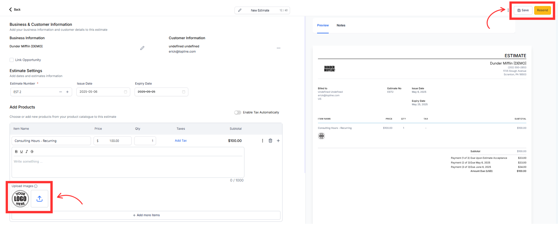 Reorder images as needed. Choose display size such as thumbnail grid or full width where available. Save, then Send. Open the customer view or PDF to confirm images display correctly.