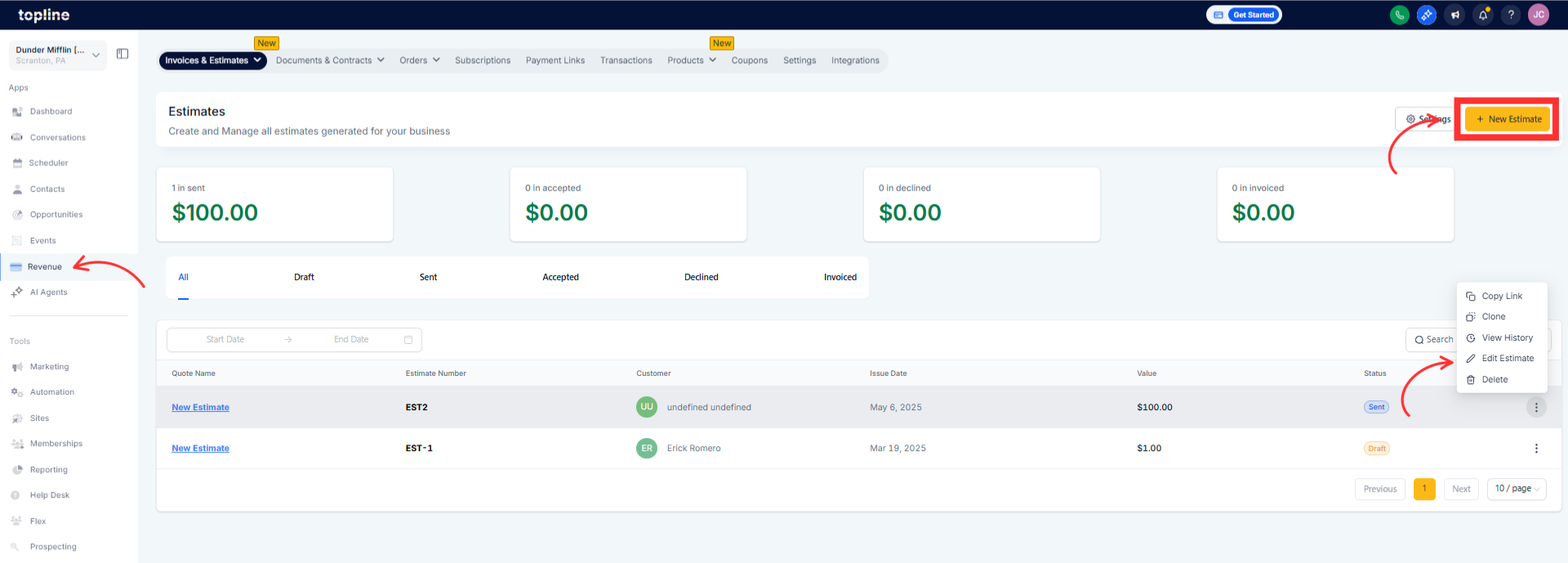 Open Revenue and go to Estimates. Create a new estimate or edit an existing one.