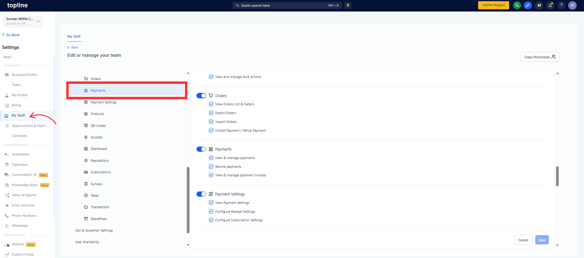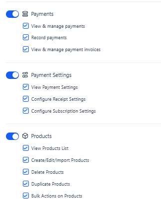 Open Settings → Roles & Permissions. Select an existing role or create one for Payments users. Under Payments, enable the needed sections (e.g., Invoices, Subscriptions, Transactions, Products, Taxes, Settings).